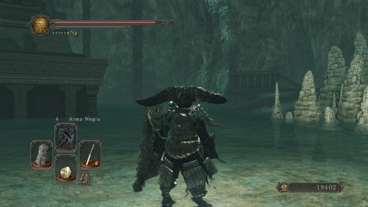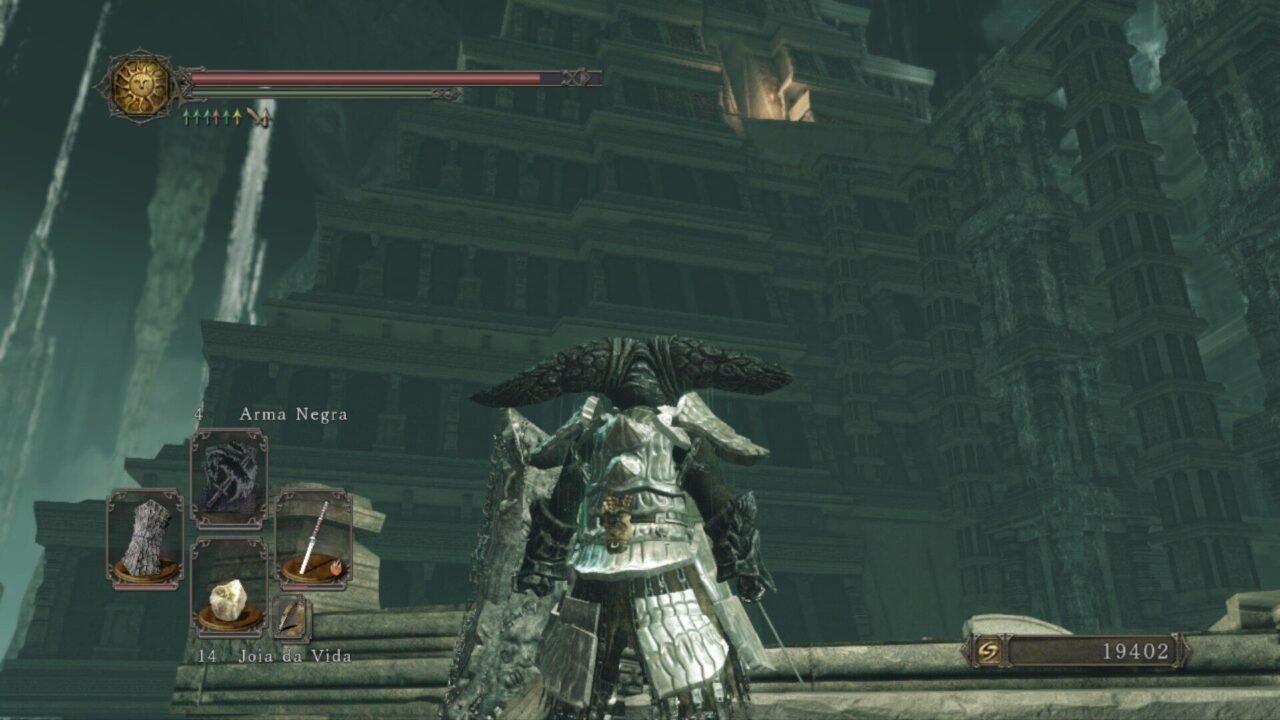 Note o pilar adiante, bata nele para fazer a construção subir do buraco central, bata no pilar novamente e suba na construção para descer com a construção, atente-se a uma plataforma no meio da descida, caia sobre ela para encontrar uma passagem, se errar, desça até o final e acione o pilar para repetir a descida. No corredor, colete a Tocha no corpo à beira do precipício, siga para o lado oposto e, no final do caminho, abra o baú para coletar o Sortilégio: Espada Grande Negra (18/23). Com isso, terminamos aqui, volte até Majula para repor seus consumíveis e gastar as almas que sobrarem subindo de nível. Se estiver pensando em usar o Machado Grande da Guarda do Dragão, já pode começar a melhorar com o ferreiro. Quando terminar, viaje para a Masmorra de Ferro na fogueira Ídolo de Eygil.