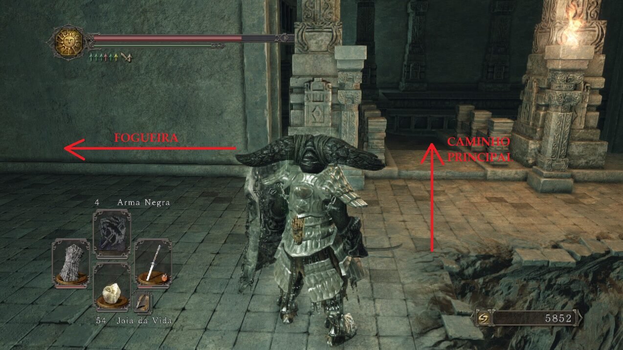 Partindo da fogueira, siga ao lado da parede direita até encontrar uma colina, comece a subir, cuidado com o lago nas bordas da colina, é um precipício, se cair, morrerá. Siga em frente, subindo a escada à esquerda para chegar a um monumento. Verifique o objeto e coloque a Pedra do Dragão nele para elevar alguns pilares, criando uma ponte. Vamos verificar isso mais tarde. Desça e atravesse a porta ao lado. Ignore o pilar e atravesse a sala indo até o final para encontrar um corpo com a Espada Grande de Sangue de Draco. Volte até o pilar, bata nele, espere o elevador aparecer e suba nele, acionando o botão no piso para subir.