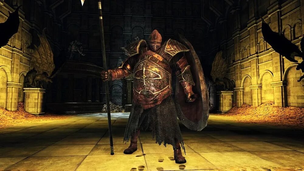 Continue em frente e derrote o próximo inimigo usando a mesma estratégia, apesar dele estar empunhando um outra arma, a estratégia servirá para qualquer desses cavaleiros, não importa a arma que ele use. Antes de passar pelo arco, verifique o corpo no balaústre para conseguir uma Efígie Humana e uma Alma de Soldado Sem Nome, siga pelo arco e derrote mais um cavaleiro, colete o talismã de Lloyd atrás da coluna e acione a alavanca que o cavaleiro proteia. Você terá de enfrentar três cavaleiros, dois com escudos e espadas e outro apenas com uma espada mais longa. Chame a atenção do cavaleiro centrar primeiro, você poderá usar a besta, matando ele à distância, contra os outros dois, use estratégia já conhecida. Vencendo todos, mova a alavanca na cúpula.