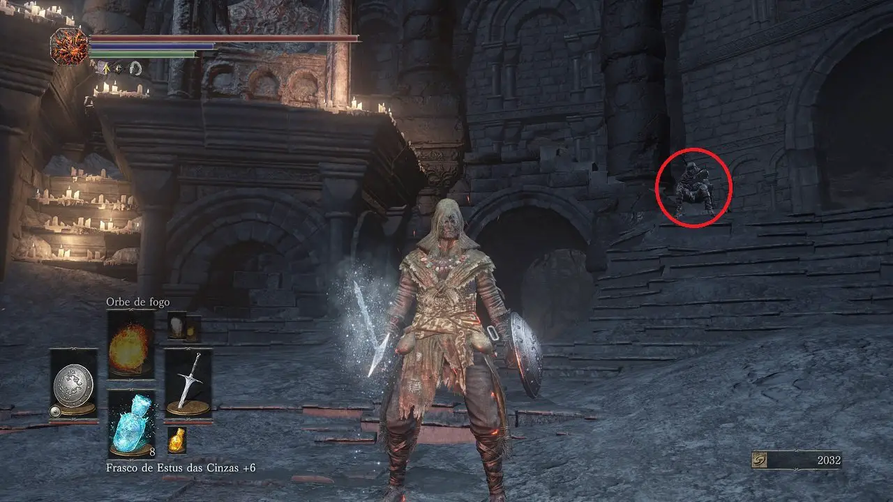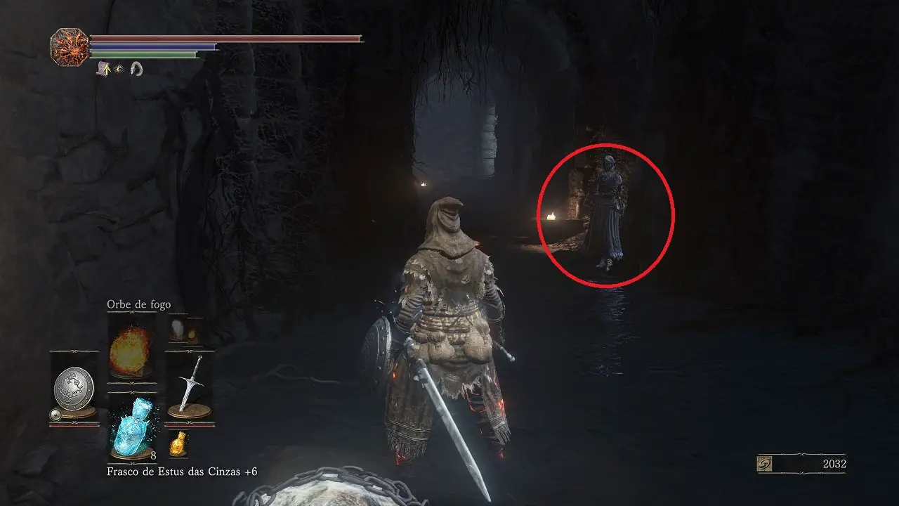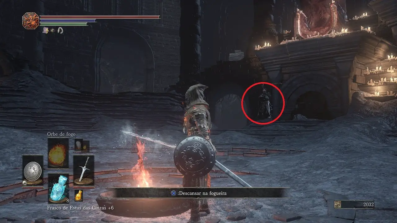 Partindo exatamente de onde terminamos o capítulo anterior, siga pelas Catacumbas de Carthus para encontrar Anri de Astora no mesmo local de antes, à direita do início da ponte que dá acesso ao Lago Fumegante. Converse novamente e quando for questionado, selecione Falar sobre a Lagoa Ardente, revelando os acontecimentos com Horace. Por isso, você receberá o Anel de olho maligno.