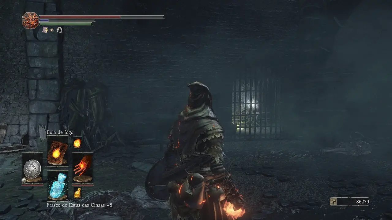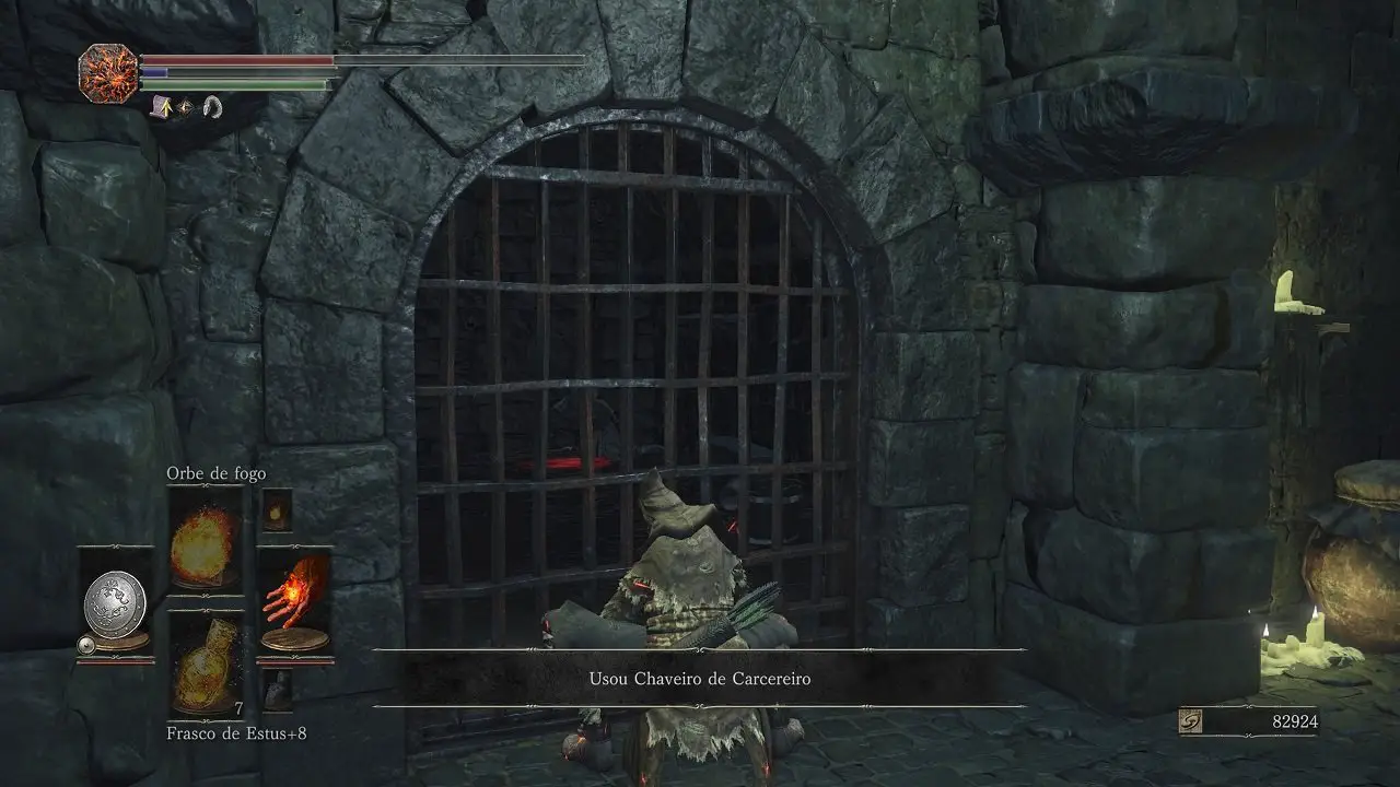 Continue em frente e derrote o Carcereiro do lado esquerdo, tomando cuidado com os diversos Prisioneiros que estão saindo da cela e outro Carcereiro patrulhando a ponte à esquerda, quanto terminar, siga o corredor virando à direita, lembra do Carcereiro e as Gaiolas após a escada? Derrote todos e use a Chave de carcereiro para abrir a cela com as Cinzas do chefe dos prisioneiros que deixamos para trás anteriormente. Feito isso, volte para o Santuário do Elo de Fogo.
