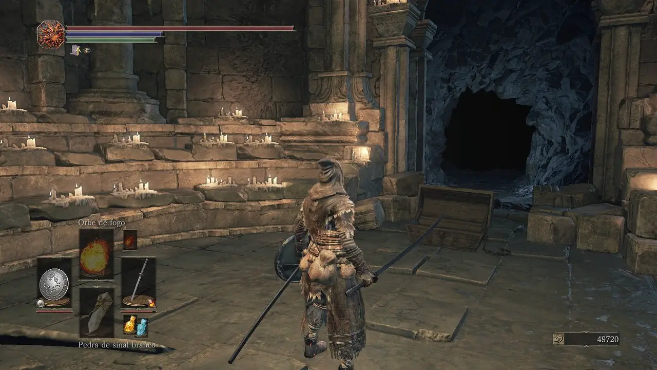 Vencendo você receberá a Alma de Oceiros, o Decaído e 40000 almas. Acenda a fogueira Oceiros, o Rei Decaído. Abra a porta de pedra adiante e siga descendo a escada, seguindo em frente, derrote o novo inimigo e na próxima sala, colete o Gesto — Caminho do dragão no corpo encostado no monumento, note que isso é obrigatório para que você possa acessar outra área que exploraremos em breve.
