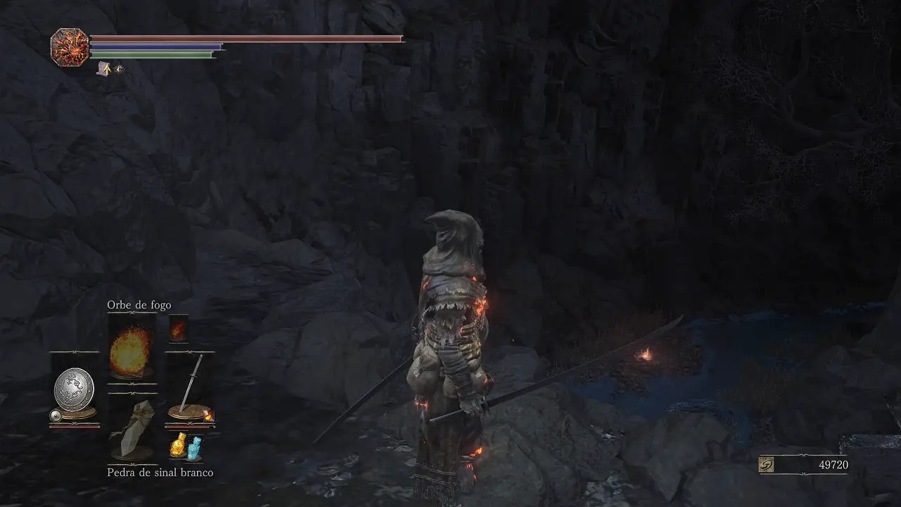 Abra o baú à esquerda para encontrar uma Escama de titanita. Siga até o baú na parte elevada e colete outra Escama de titanita, atrás desse baú, golpeie a parede para revelar uma passagem secreta, siga pela caverna e desça, descanse na fogueira Túmulos Abandonados, continuaremos no próximo capítulo.