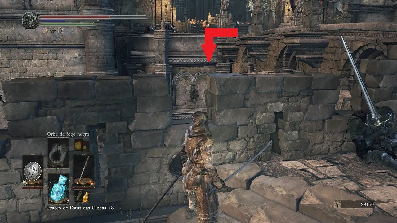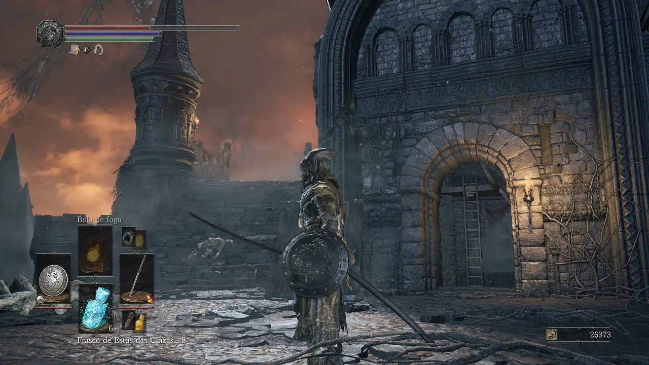 Faça o que mais precisar e siga para a fogueira, queime o Fragmento de osso de Morto-vivo e volte para fogueira Castelo de Lothric: Armadura do Matador de Dragões. Partindo da fogueira, siga em frente pelas escadas até encontrar a fogueira Grande Biblioteca, continuaremos no próximo capítulo.