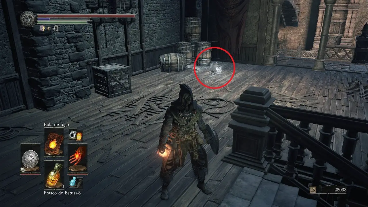 Colete o Fragmento de Osso de Morto-vivo, desça no fosso e no canto direito, derrote o inimigo e colete a Titanita Cintilante, nos outros corpos, colete o Pedaço de titanita. Notou o item na plataforma superior? Pegaremos ele mais tarde, siga em frente e derrote o inimigo à esquerda antes que ele se transforme, entre na porta adiante e atrás dos barris, colete a Urna de raio. Logo que passar pela porta, note o Lagarto correndo no topo da escada e um inimigo mais a frente, derrotando ele, você consegue uma Titanita cintilante.