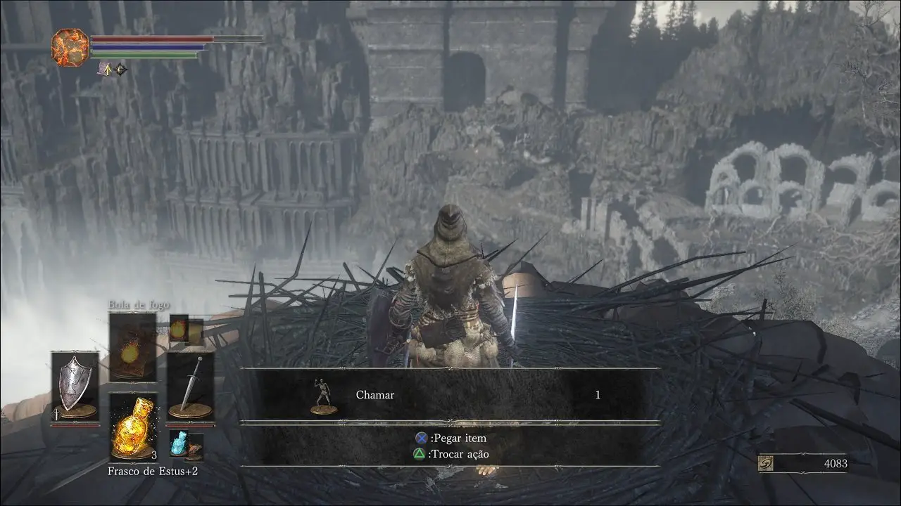 Feito isso, siga para o nível superior do santuário e saia, passando pelos arcos quase atrás do trono maior. No topo, abra o portão da torre usando a chave que acabamos de comprar. Suba até o topo da torre e note a passarela que leva a área diretamente acima do Santuário do Elo de Fogo. Antes de seguir diretamente para a torre do lado oposto, perceba que você pode descer à esquerda da ponte, caindo em um telhado. Desça com cuidado, usando a plataforma intermediária. Na extremidade do telhado há um ninho de pássaro com um pássaro invisível que falará com você. Você pode deixar certos itens em seu ninho e ele lhe dará outra coisa em troca. Nesse momento, deixe um Osso do regresso, você será recompensado com o Gesto — Chamar (5/26) e o Bracelete de ferro.