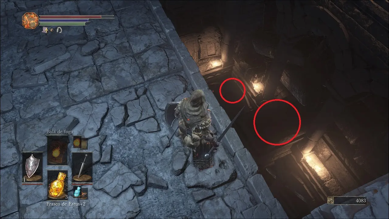 Siga para o telhado do lado do portão que abrimos anteriormente, na parte mais baixa, ao lado da torre, derrube a escada para criar um atalho, suba novamente e note o corpo à esquerda do ninho, colete o Osso do regresso. Suba mais uma vez e do lado direito da escada, note um Lagarto na parte inferior. Caso consiga derrotar ele antes que ele fuja, você receberá uma Titanita Cintilante.