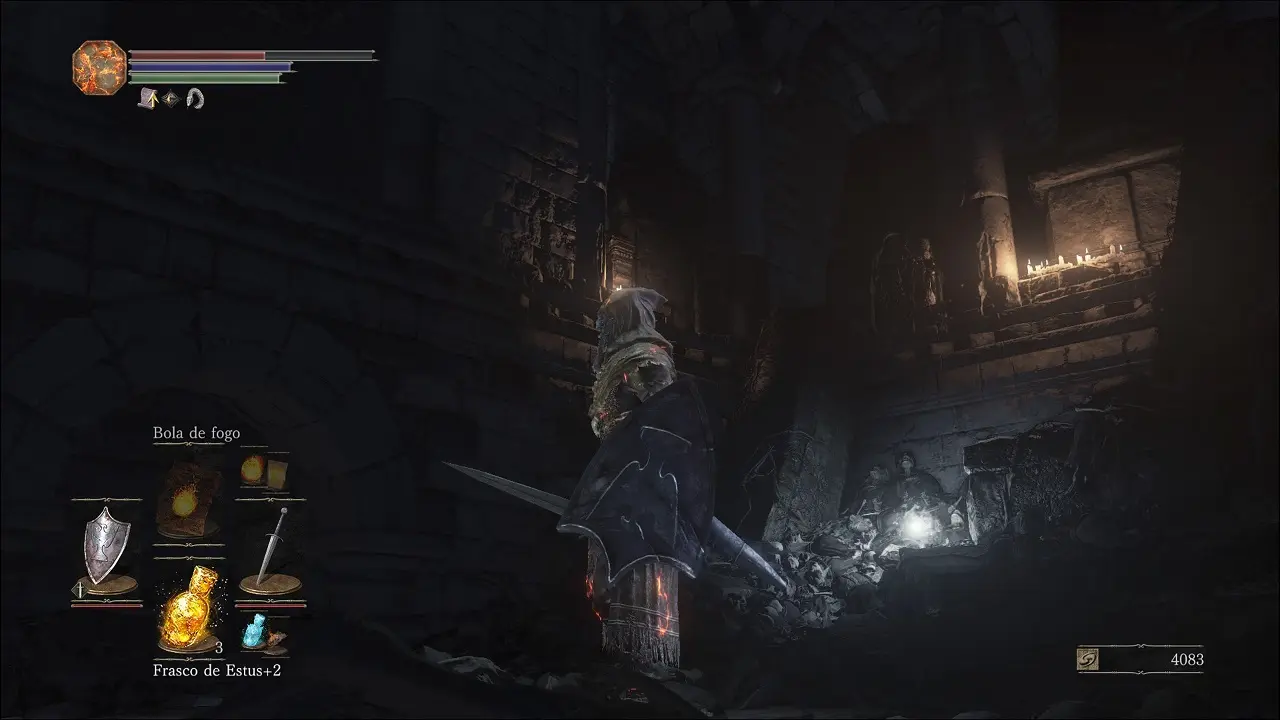 Terminamos tudo que podíamos fazer aqui nesse momento. Na fogueira, caso não tenha feito, queime o Fragmento e osso de Morto-vivo, caso não tenha feito ainda. Viaje para a fogueira Estrada dos Sacrifícios: Bosque da Crucificação.