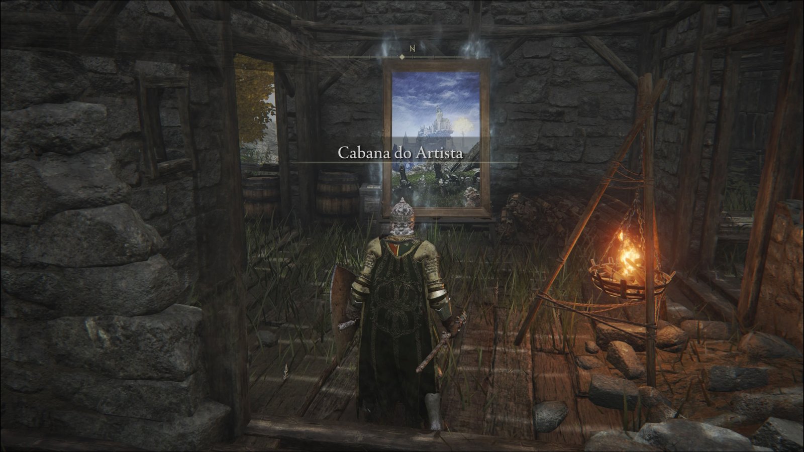 Esta é a Cabana do Artista daqui de Liurnia dos Lagos. Ative o Local de Graça: Cabana do Artista e entre na cabana para pegar a Pintura: Ressurreição. Diretamente a leste daqui, pegue a Pedra de Forja no corpo sentado na cadeira. É só isso que encontrará nesta cabana, então volte pela estrada de terra para o sul, até o pântano onde enfrentamos o Marinheiro de Tíbia. Vê essa imensa construção que serve de alicerce para a ponte no lado leste, na beira do precipício? Vá para a parte sul dessa construção, e olhe para baixo para ver um vilarejo lá embaixo. Desça pelas lápides na pedra, que formarão uma espécie de escada, para descer em segurança até o telhado lá embaixo.