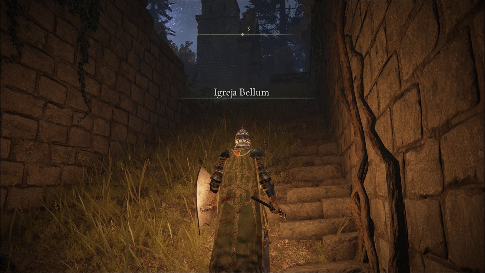 Esse local se divide em quatro campanários. Os três primeiros possuem um portal cada, mas eles estarão desativados. Para ativar cada um dos portais, precisará primeiro acionar um mecanismo especial ao lado de cada um deles. Cada mecanismo exige uma Chave de Espada Imbuída para ser ativada, e você não deve ter nenhuma no momento. Pois bem, vá para a parte mais alta da colina e ative o Local de Graça: Os Quatro Campanários. Ao lado do local de graça, fica o quarto campanário, que não terá um portal, e sim um baú. Abra o baú para obter uma Chave de Espada Imbuída, justamente o item que precisávamos para abrir esses portais. Só para entender, cada um desses portais leva a um local diferente, e são locais específicos e isolados, ou seja, não irá realmente explorar áreas novas, apenas conhecer uma pequena fração de lugares novos, pegar algum item ou enfrentar algum chefe. Alguns deles podem ser muito complicados para o nosso nível atual. Como só tem uma chave, recomendo que abra o portal do segundo campanário de baixo para cima da colina, no canto nordeste, onde tem um aviso escrito Precipício da Antecipação. Entre no portal.