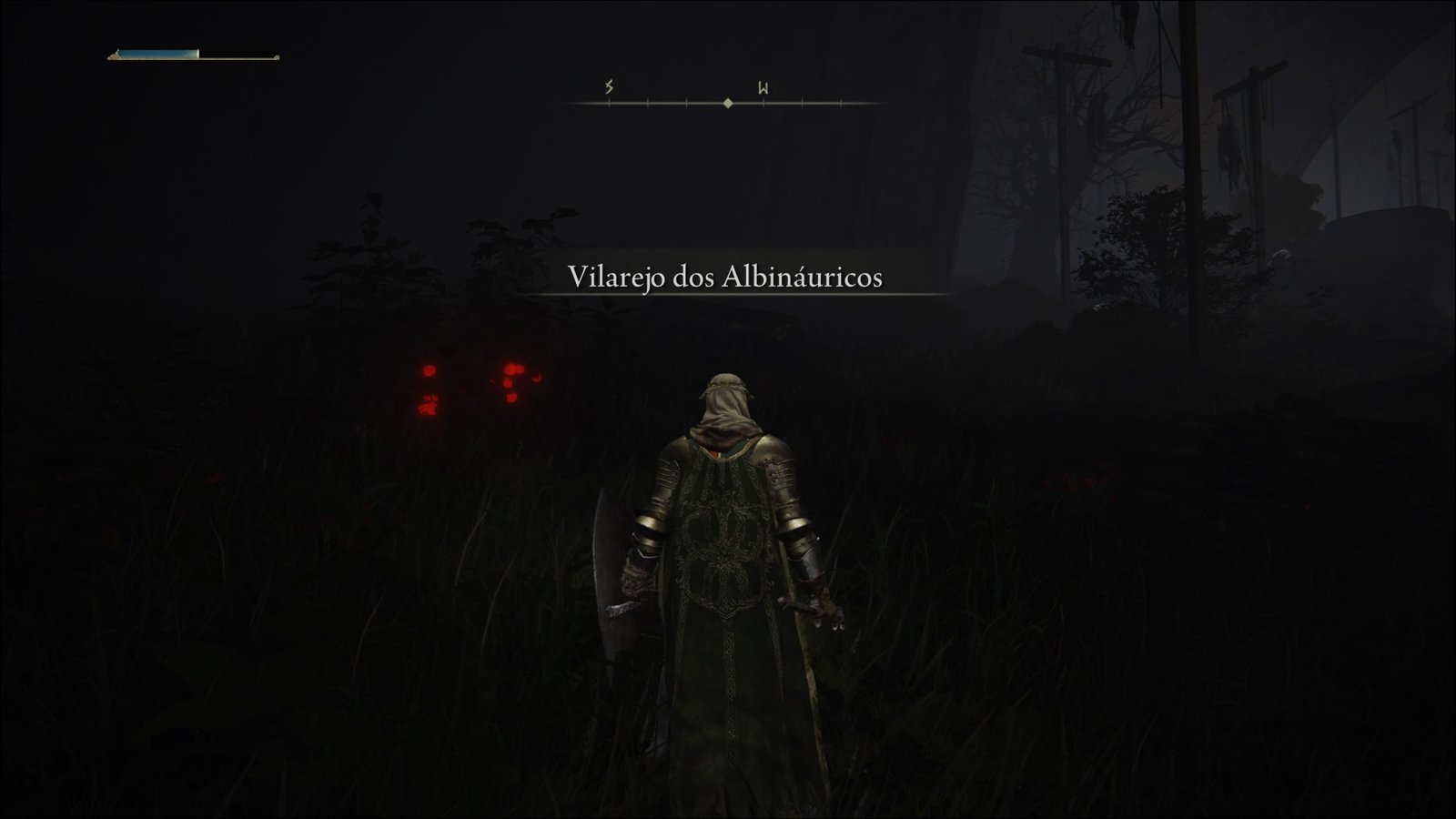Siga na direção sudoeste, e passará por algumas rochas enormes. Do outro lado destas rochas, deverá ver um gazebo, vá até ele e ative o Local de Graça: Gazebo no Lago. Siga para o sul daqui. Verá um terreno pantanoso, de cor amarelada. Esse terreno é venenoso, então fique montado no Torrente para não se envenenar. Pegue 2 Pedras de Forja no corpo encostado na árvore. Siga na direção sul, e encontrará diversos Caranguejos Gigantes no pântano, proceda com cuidado. Continue indo para o sul até uma grande parede de pedras, e então vá para o leste. Em uma porção de terra, encontrará um Escaravelho. Mate-o para conseguir a cinza da guerra Voto do Indomável. Esta cinza da guerra é muito boa, ela é equipada em escudos e concede invulnerabilidade momentânea. Recomendo que equipe. Agora siga a parede de pedras enquanto vai para oeste e mate mais um Caranguejo Gigante. Logo verá um trecho de terra e uma rampa. Suba a rampa, e entrará no Vilarejo dos Albináuricos.
