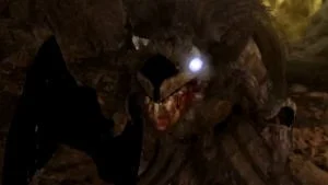 Ative o Local de Graça: Cavernas da Fenda do Dragão. Logo de cara, mais adiante, será recepcionado por um urso rúnico. Você pode enfrentá-lo ou tentar passar agachado e desapercebido, fica a seu critério. Eu pessoalmente aconselho a passar agachado. Primeiramente, siga pela caverna a sudoeste. Vire à direita e pegue Runa Dourada e Pedra de Aquecimento nos corpos. Vá seguindo o túnel até o final, e encontrará o Talismã: Talismã de Touro-Cabra, que aumenta o equilíbrio do portador. Volte ao começo da caverna e siga pelo túnel a noroeste. Vá em frente e encontrará um buraco. Caia por ele, mas descendo de plataforma em plataforma. De cima da pedra, verá alguns lobos lá embaixo, mate-os usando magia. Depois de matá-los, desça e pegue Sangue de Fera e Runa Dourada no local. Siga para o sul, e verá mais um buraco. Desça por ele, de plataforma em plataforma, para encarar o chefe da área.
