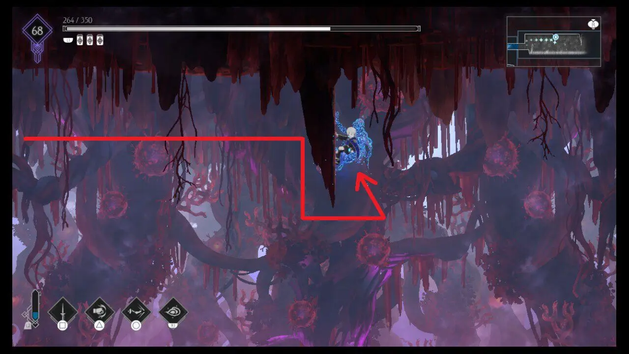 Faça esse processo até chegar no final, rompendo a última barreira para coletar o Minério de Amuleto . Volte para a parte de cima e siga a esquerda, subindo pela cachoeira de água limpa. Derrote todas as plantas aqui e na parte superior, note o sarcoma no piso, use Motley para romper essa passagem e encontrar a Joia Primeva dos Núcleos. Volte para a sala anterior e siga a esquerda. Do último pilar antes da passagem inferior esquerda, impulsione-se para o teto e projete-se a esquerda para encontrar uma Passagem Oculta no canto superior direito, você precisará romper a parede. Volte por toda área até a entrada inicial a direita, sobre a cachoeira envenenada, note a parede onde você pode se agarrar, faça isso e tome impulso para a esquerda, rompendo a parede.