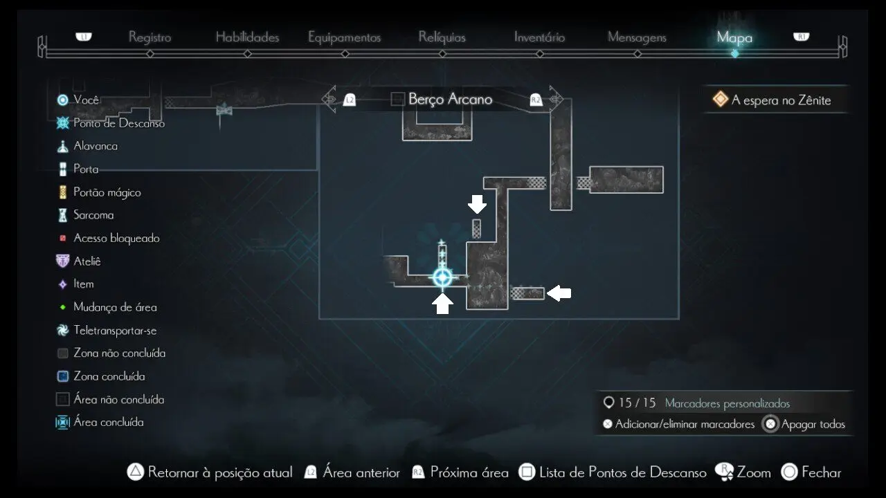 Note que o canto inferior direito do mapa deve estar com uma pequena passagem, ainda inexplorada. Partindo do Ponto de Descanso, saia pela direita e continue descendo indo a direita até chegar na entrada do Berço Arcano.