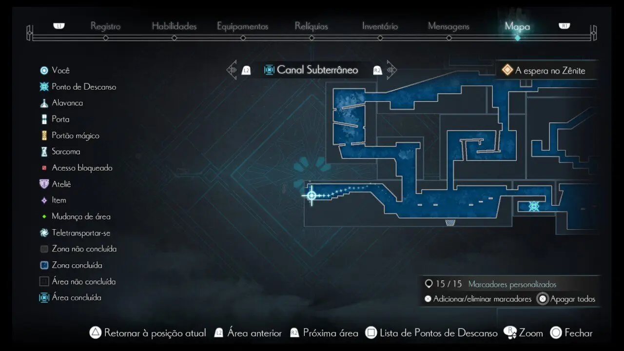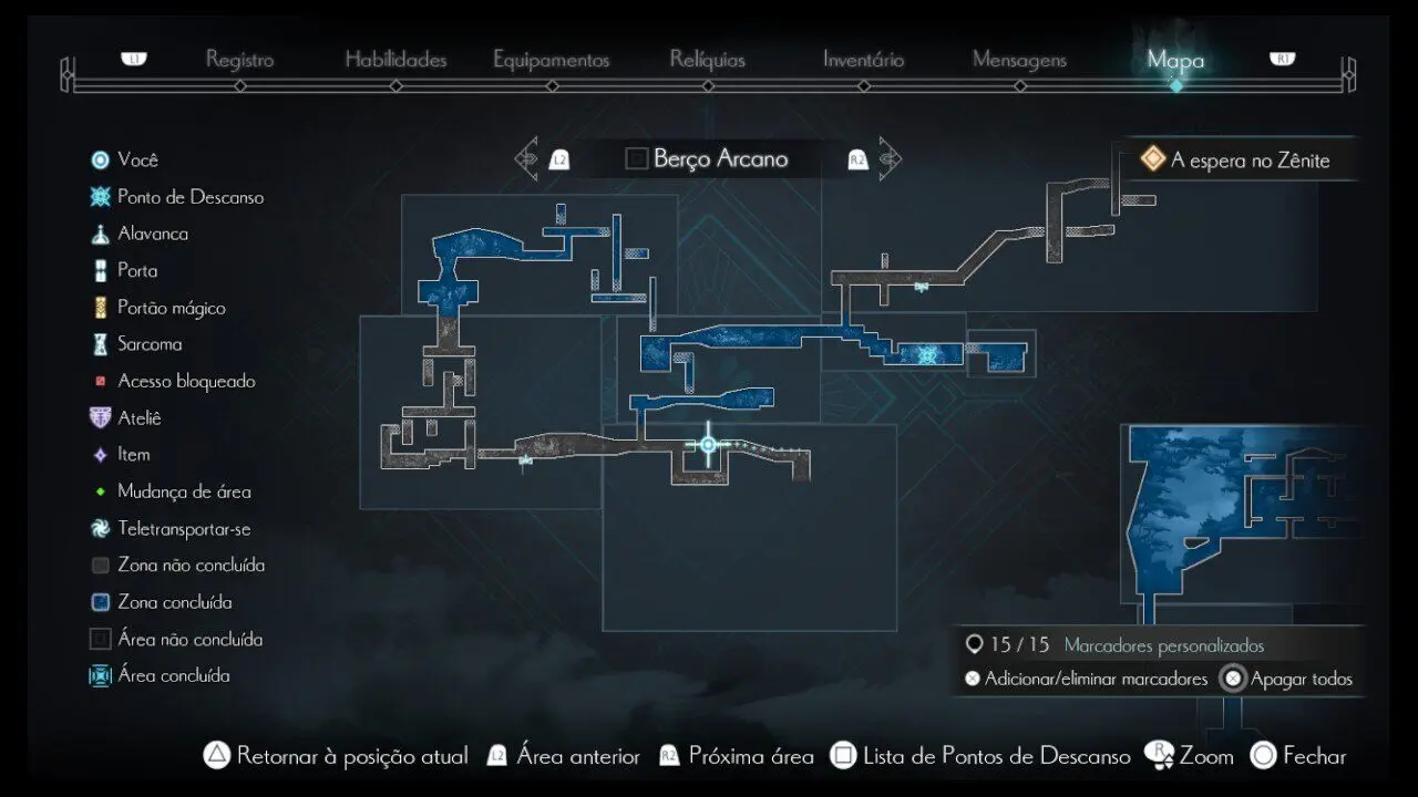 Abrindo o mapa, você deverá ter todo o Berço Arcano explorado, assim como os outros mapas, apenas um local no Distrito Central deve estar cinza. Caso não, fique a vontade para fazer uma Viagem Rápida para qualquer lugar (exceto o que mencionei) para explorar o que tenha deixado para trás. Feito o que precisar, vamos para aúltimar parte desse capítulo.