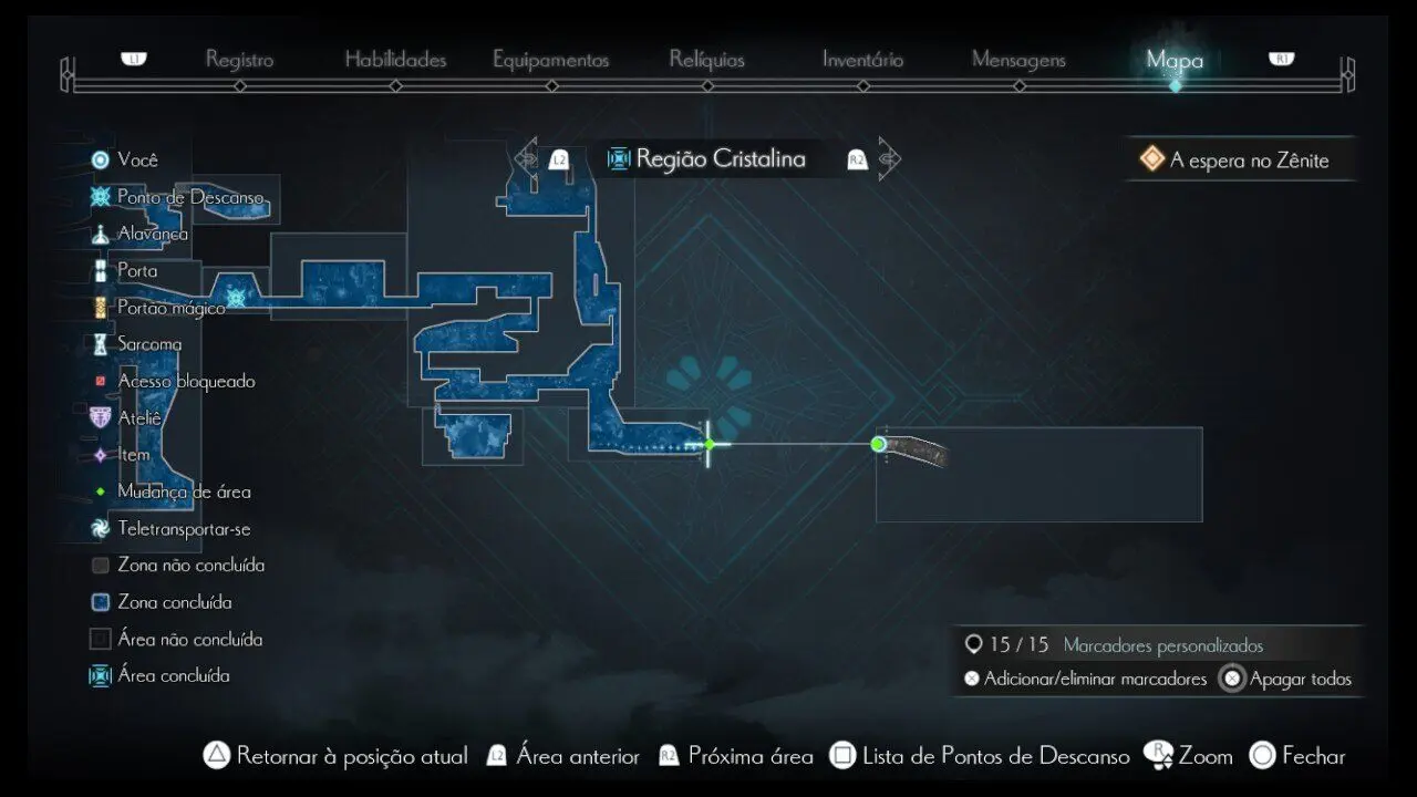 Antes de qualquer coisa, faça uma Viagem Rápida para a Floresta Carmesim no Ponto de Descanso: Vilarejo da Floresta. Saia pelo lado direito e siga em frente até onde estava a flor vermelha para começar uma conversa com a sacerdotisa. Esse é o primeiro evento que desbloqueia o FINAL VERDADEIRO. Isso deve completar essa área, caso tenha alguma área cinza no seu mapa, aproveite para explorar e completar esse mapa. Quando terminar, faça uma Viagem Rápida para a Região Cristalina no Ponto de Descanso: Via Sem Corrupção.