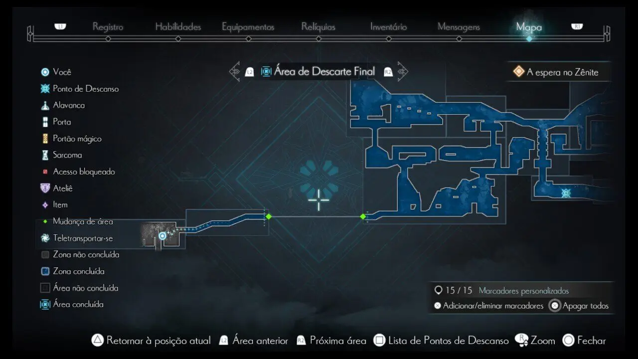 Com os portões abertos, siga em frente para encontrar outra Fera Primordial Fixada, dessa vez, no teto. Quando terminar com ela, suba e siga em frente para encontrar Rubin! Como sempre, ele nos agraciará com um belo presente, dessa vez, você receberá a Tábua do Berço Arcano, outro item primordial para revelar o final VERDADEIRO. Esse foi nosso último encontro com o simpático Rubin. Siga para o beco a esquerda e impulsione-se para cima, revelando uma Passagem Oculta e um baú com generosos Materiais x14000, suba mais e isso completará o mapa. Vamos viajar para a Área de Descarte Final no Ponto de Descanso: Sala de Controle.