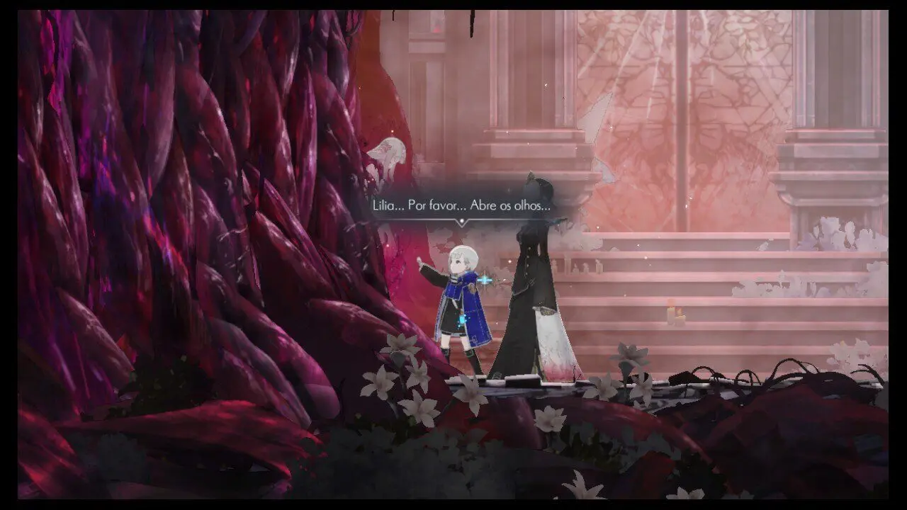 Chegando nessa área cinza, a Sacerdotisa estará lhe esperando diante da Flor que vimos muito tempo antes disso. Conversando com ela, daremos alguns itens que conseguimos durante nossa exploração e receberemos o Tesouro de Brilho Sutil. Qando estiver no controle novamente, volte para O Berço Arcano, Onde Lilia está presa pela corrupção, ou seja, caso não se lembre, a sala posterior onde estava a Sacerdotisa. Se aproxime de Lilia para iniciar uma cena.