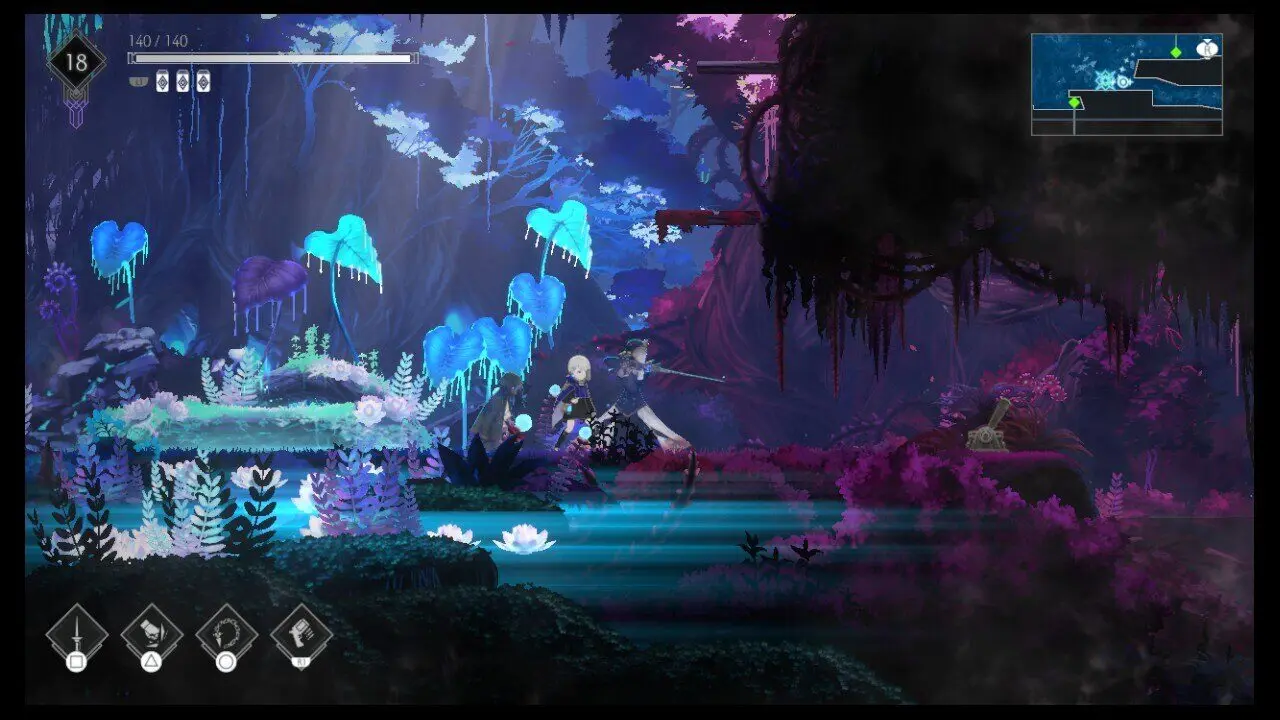 Use a saída inferior à direita, chegaremos em um local alagado, diferentemente das outras áreas com água, não queremos cair aqui, por existirem inimigos, caso isso aconteça, saia da água rapidamente para não levar dano. Indo pelas plataformas, lide com as borboletas enquanto segue a esquerda, quando encontrar um tronco mais fino (quarta plataforma), salte sobre ele e desça na plataforma abaixo para sair pela passagem. Vire a alavanca e nade indo para o lado esquerdo, continue e use mais uma alavanca, você deve ter notado que estamos no Ponto de Descanso: Grande Árvore da Floresta, criamos um atalho, aproveite para salvar seu progresso.