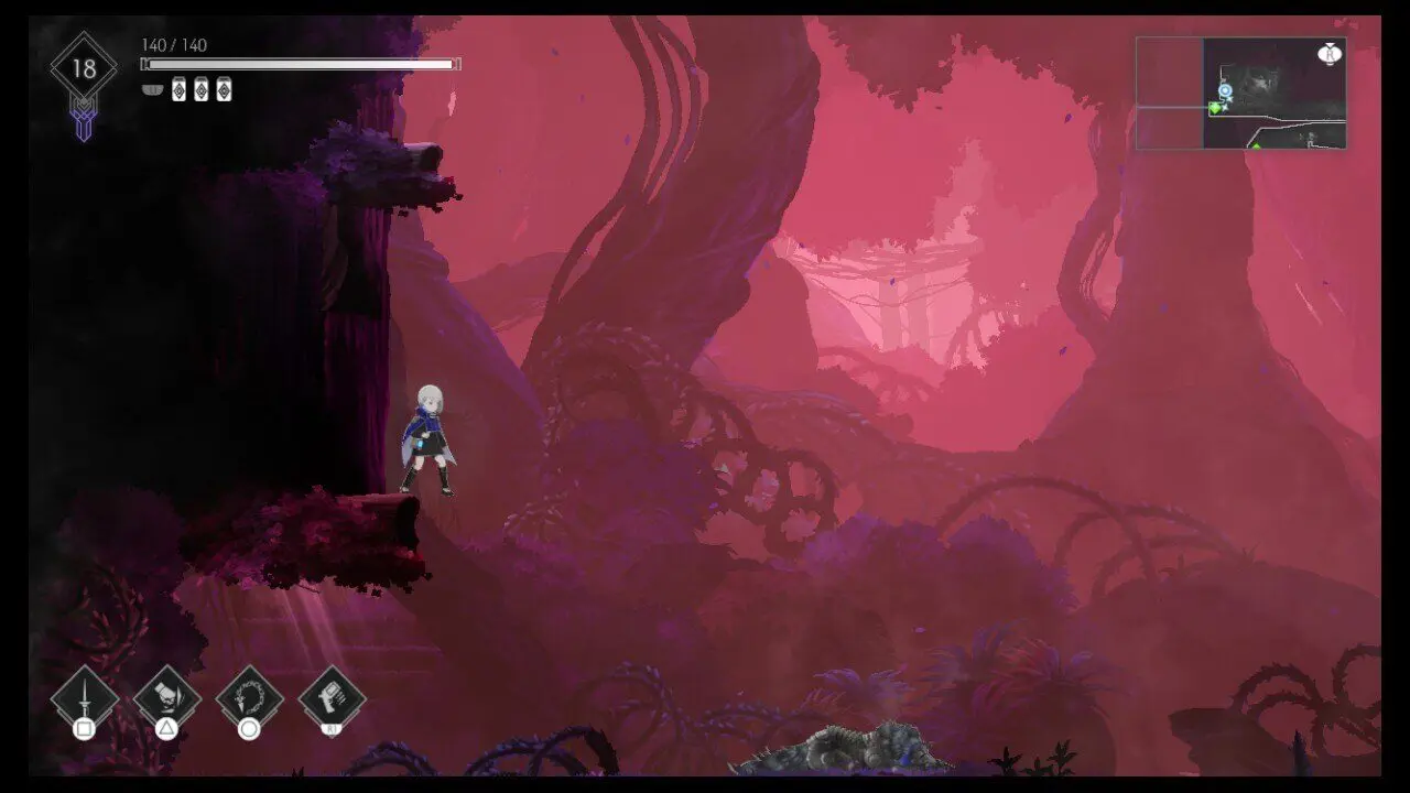 Volte até a sala anterior e comece a descer lidando com os inimigos, quando o mapa estiver completo, volte até o Ponto de Descanso: Grande Árvore da Floresta, salve seu progresso e use a saída abaixo de você. Logo que entrar, estaremos em uma bifurcação, siga a direita lidando com a algumas borboletas, no final, teremos mais uma bifurcação, onde poderemos ir para baixo ou para a direita, vamos à direita. Encontraremos alguns inimigos, um deles com uma espada, nada de especial, apenas tome cuidado para não ser atingido pelos ataques que vem de cima. Aqui, iremos usar as plataformas para sair pelo nível superior, na plataforma esquerda, sairemos em um beco com Materiais x200, volte.