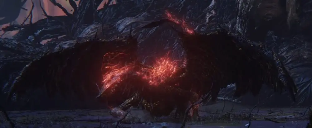 Desça e ative o Local de Graça: Passagem nas Raízes. Vê a entrada ao norte? Prepare-se e entre. A arena a seguir estará vazia, a princípio. Siga para o nordeste, em direção ao imenso dragão ao fundo, mas não se preocupe: ele não será o chefão. Teremos outros inimigos como chefe.