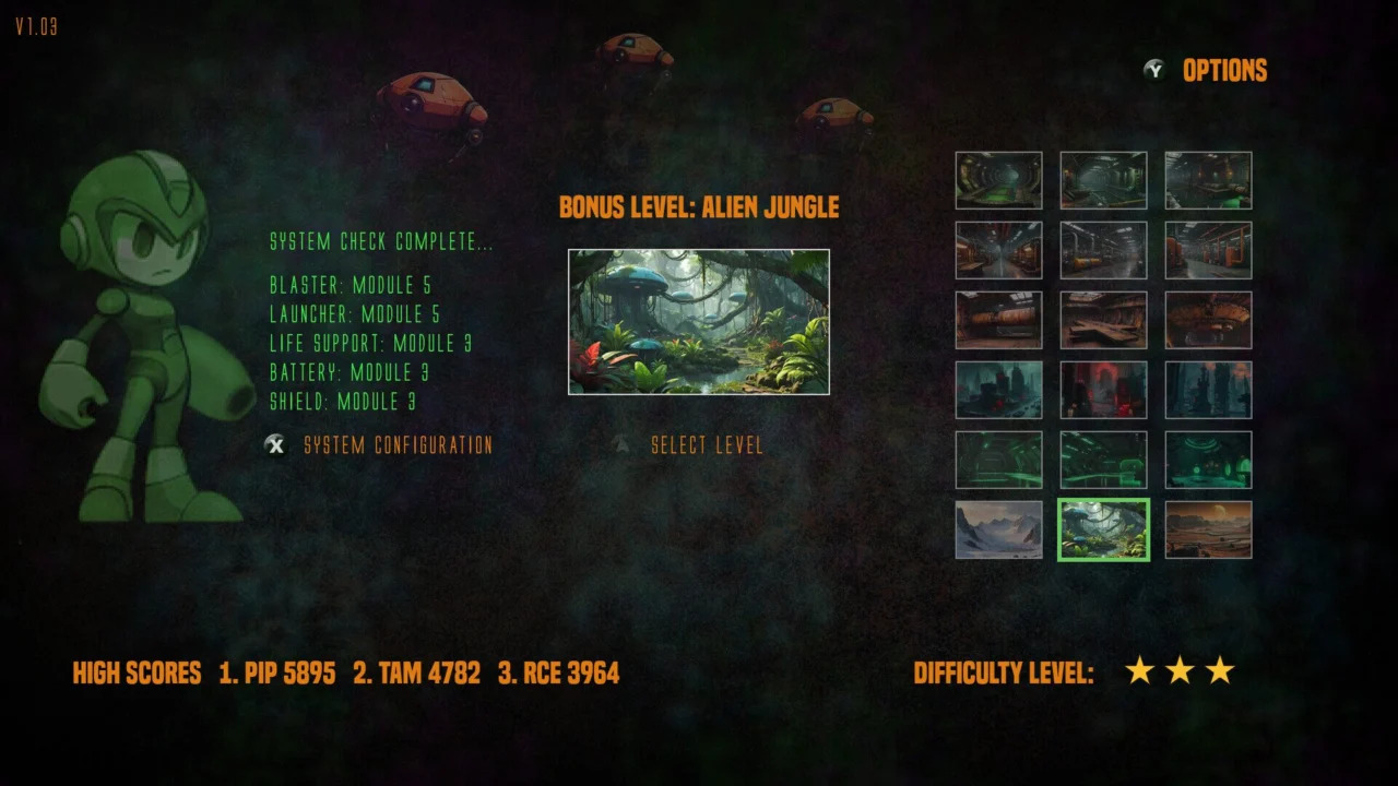 Durante os níveis, você terá de ser rápido e preciso, para saltar e atirar, pois muitas das vezes, o espaço para fazer isso é limitado e com pouco tempo para atacar. Conforme você melhora seus atributos, a sensação de evolução é constante, principalmente nos níveis mais baixos de dificuldade, nos maiores, nem tanto, pois os inimigos são mais resistentes. Os níveis de dificuldades variam de uma a quatro estrelas. Você pode repetir cada fase quantas vezes quiser, recolhendo melhorias para se preparar para os outros níveis.