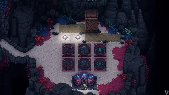 Continue escalando a antes de passar pela porta, pegue o Minério de Safira, veremos que estamos sendo observados. Após a cena, estaremos no mapa, siga para um novo local.