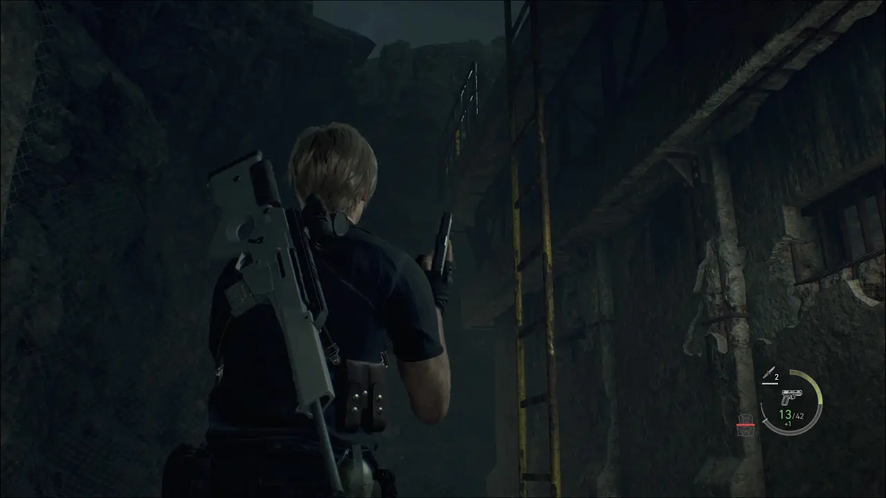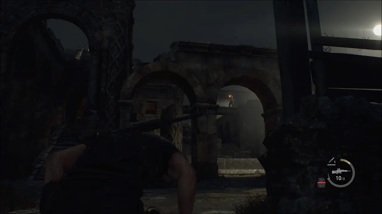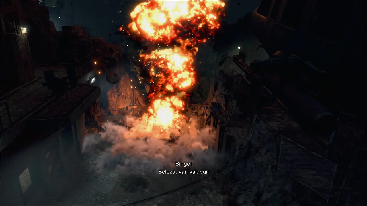 Siga subindo as escadas a esquerda, e na parte superior abra o armário para pegar mais itens. Preserve o baú explosivo, pois mais inimigos vão aparecer. Atraia eles até o barril e use ele para acabar com os inimigos. Quando estiver na parte com a grande escada ao centro, entre pelo portão a direita e pegue os itens no local, em seguida suba as escadas e acabe com os inimigos que vão aparecer. Nessa parte superior, olhe para o edifício a frente e repare no Bruto que esta olhando para a parede, atire nessa posição.