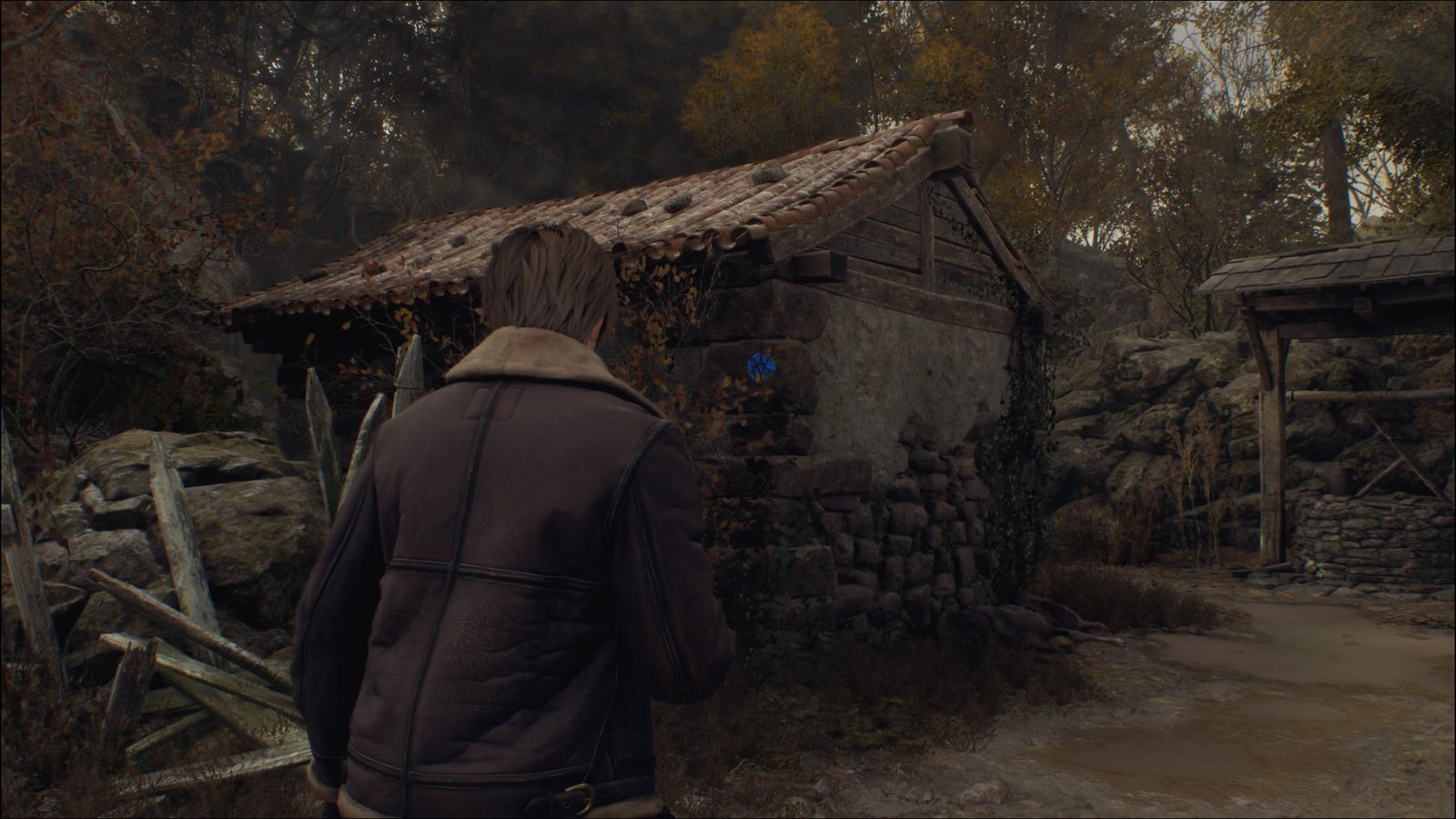 Continue pela trilha, e tome cuidado com a Armadilha para Ursos no chão. Desvie e continue. Quando chegar perto de uma cabana à sua esquerda, tome cuidado, pois há um inimigo dentro dela. Após acabar com ele, entre e pegue Munição para Pistola, uma Granada de Atordoamento e uma Erva Vermelha. Esta granada atordoa inimigos, recomendo que deixe um atalho para ela. Já a erva vermelha é uma versão avançada da erva verde, que não cura, mas intensifica outras ervas. Combine-a com a Erva Verde para formar um Mix de Ervas, um item curativo poderoso. Saia da cabana, desça a trilha e passe pelo portão para chegará área principal do vilarejo.