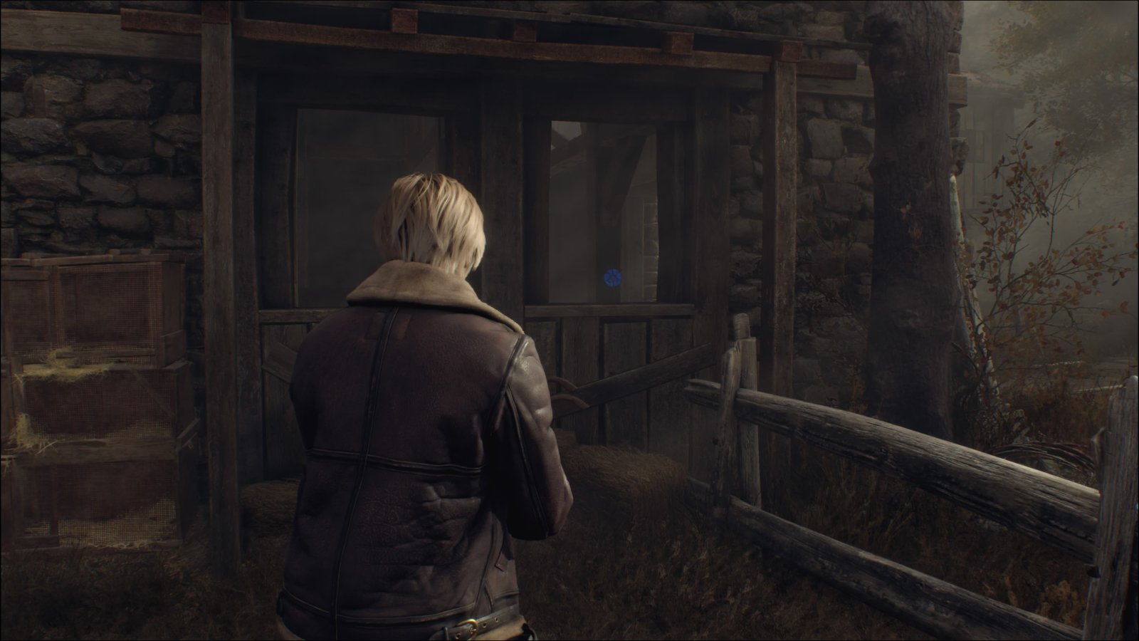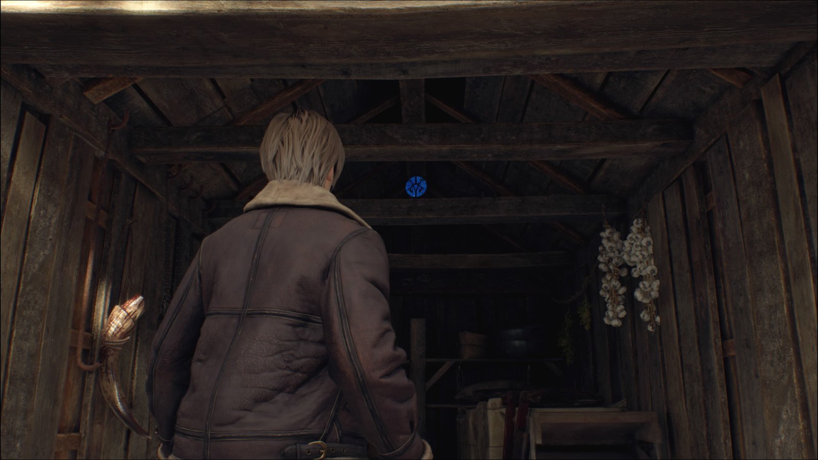 Siga em frente e entre na cabana à direita para encontrar um Barril e uma Máquina de Escrever. Organize seu inventário, e veja que há poucas coisas que pode guardar na Despensa. Coloque os Sprays de Primeiros Socorros na Despensa, salve seu progresso e saia. Siga para o leste, e agache-se, pois poderá matar uma Aldeã desprevenida, em um ataque furtivo. Ainda agachado, volte alguns passos e passe por dentro do estábulo aberto a noroeste. Do outro lado, há mais um Aldeão aqui, junto dos porcos, e poderá matá-lo furtivamente também. Agora que matamos os inimigos, poderemos investigar o local. Comece voltando até a cabana com a máquina de escrever. Ao norte da cabana, olhe para a parede da cabana para encontrar um medalhão azul pendurado. Estes itens são colecionáveis, e terá de destruir todos eles. Destrua o Medalhão Azul (Fazenda 1/5).