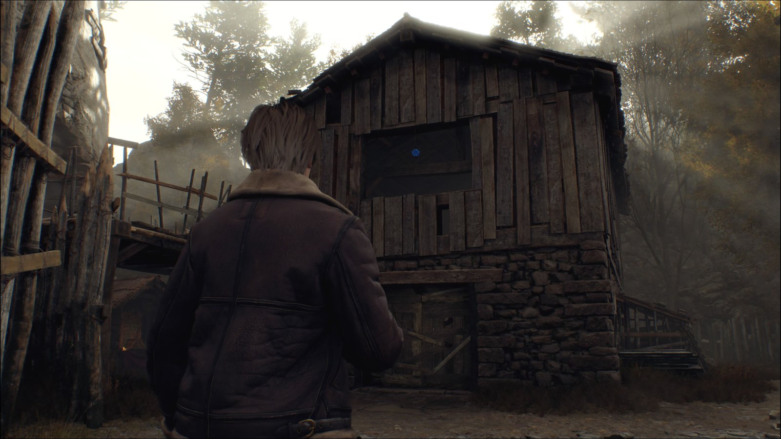 Agora a coisa complica. Essa área será nosso primeiro desafio real no jogo. Não temos condições de enfrentar a todos ao mesmo tempo, então corra para a terceira cabana do lado norte. Assim que entrar, verá uma cena, no qual Leon irá barrar a porta. Rapidamente empurre a outra estante para cobrir a janela, e vá para trás da escada para pegar um Spray de Primeiros Socorros, Munição para Pistola e quebrar alguns Barris. A porta não vai durar muito, e logo entrará um Aldeão com Motosserra. Suba a escada e pegue a espingarda W-870 no mostruário. Também quebre o vidro da estante para pegar uma Granada de Mão. Alguns Aldeões entrarão pela janela, então mate-os e então empurre a escada, impedindo-os de subir pela janela. Pegue Cartuchos de Espingarda na cama, equipe a W-870 e fique atento, pois o Aldeão com Motosserra subirá rapidamente. Atire na cabeça dele com a espingarda, e esteja pronto para aparar seus golpes com