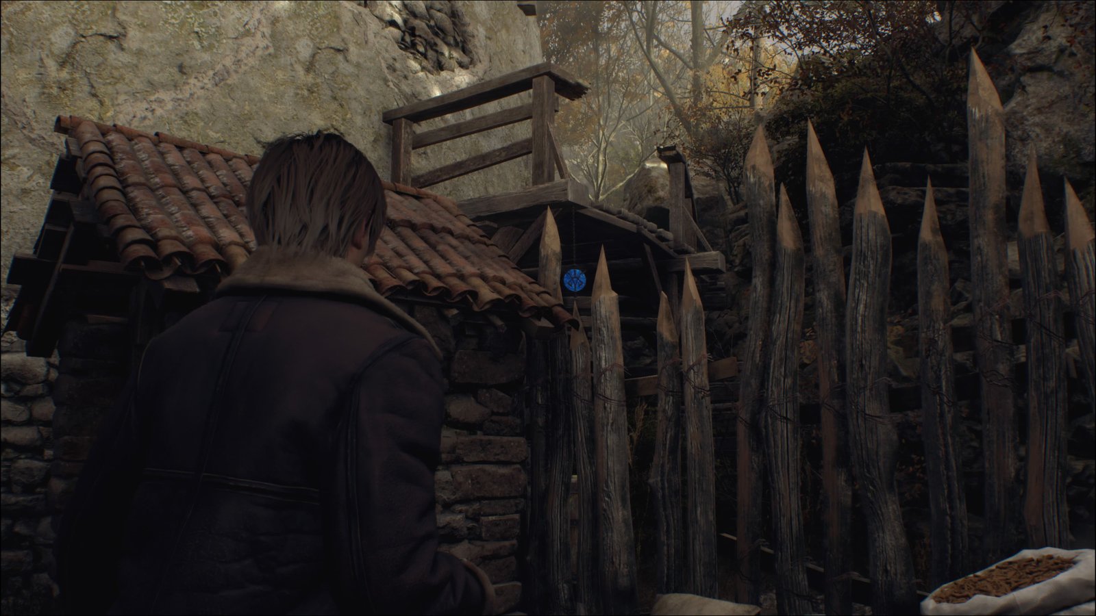 Com o portão aberto, desça e atravesse a ponte. O portão adiante está trancado, então quebre os Barris e siga para a esquerda para quebrar mais um Barril e uma Caixa. Volte para o portão e siga para o leste. Empurre o carrinho bloqueando a passagem e continue pela trilha. Quebre o Barril e prossiga até o momento em que um Aldeão irá lançar um explosivo e derrubar escombros sobre o Leon. Pressione