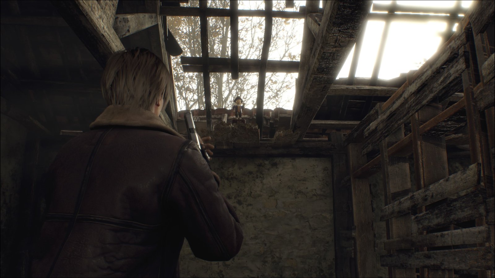 Assim que a cena terminar, estaremos fora do Chalé. Siga pela trilha e atravesse a ponte. Diante de uma velha casa, verá um Barril. Quebre-o com golpes físicos para conseguir Munição para Pistola. Recarregue a sua arma pressionando