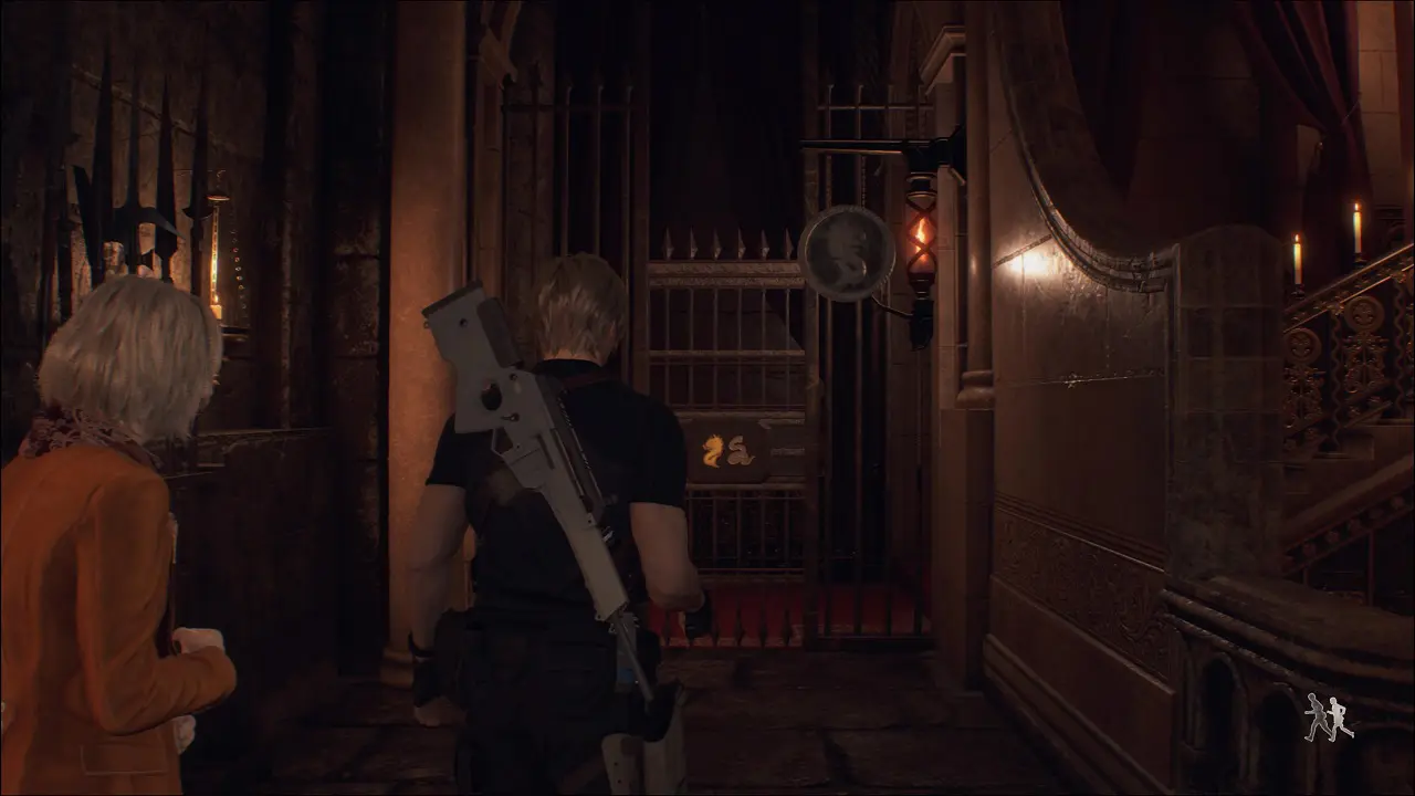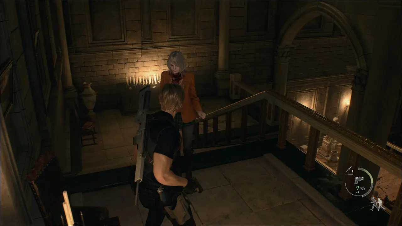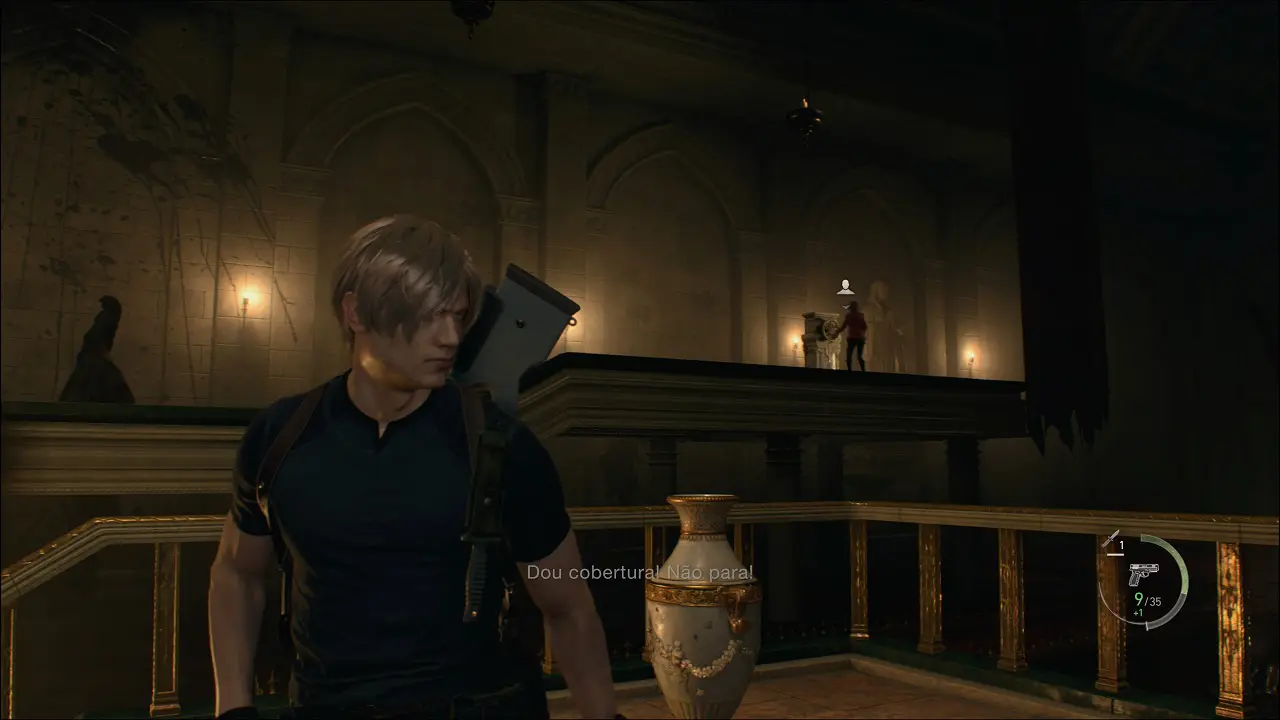 Suba pela escada que acabou de baixar e vire diretamente a esquerda, subindo outro lance de escadas, mais ao fundo teremos um vaso. Faça o mesmo do outro lado. Agora, precisaremos impulsionar Ashley para a esquerda para que ela acione as outras duas rodas. Enquanto ela está fazendo isso, os inimigos aparecerão para atacá-la e a você também, Mantenha Ashley em segurança e permaneça vivo, consequentemente.