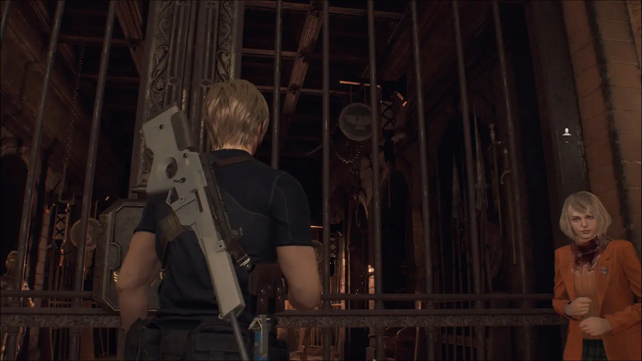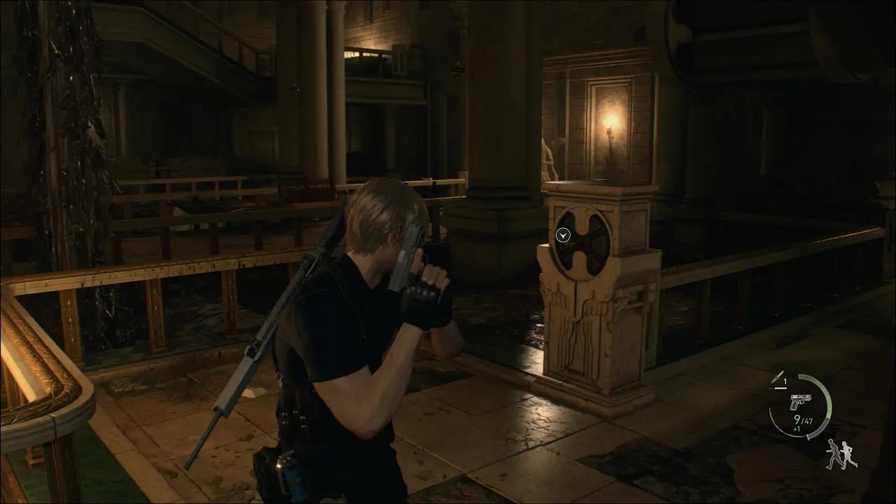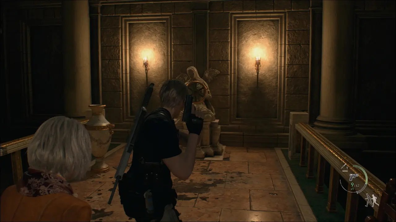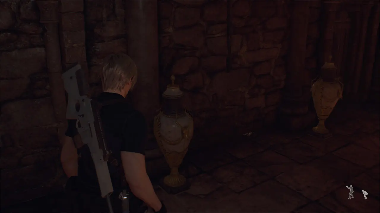 Suba pela escada que acabou de baixar e vire diretamente a esquerda, subindo outro lance de escadas, mais ao fundo teremos um vaso. Faça o mesmo do outro lado. Agora, precisaremos impulsionar Ashley para a esquerda para que ela acione as outras duas rodas. Enquanto ela está fazendo isso, os inimigos aparecerão para atacá-la e a você também, Mantenha Ashley em segurança e permaneça vivo, consequentemente.