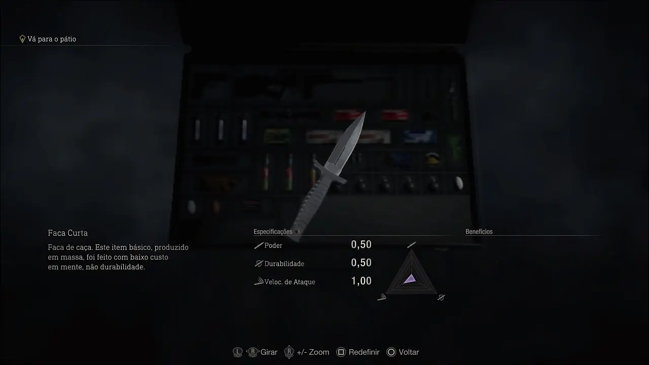 Siga descendo as escadas e pegando a Erva Vermelha e a Munição. Estaremos em uma masmorra, onde alguém está preso, repare que em uma cela a esquerda temos mais um item. Siga até encontrar a Chave da Masmorra em um cadáver, ao pegar esse item, cairemos e teremos nosso primeiro contato com um inimigo específico, o Garrador. Teremos de matar esse inimigo apenas com a Faca para conseguir um troféu / conquista.