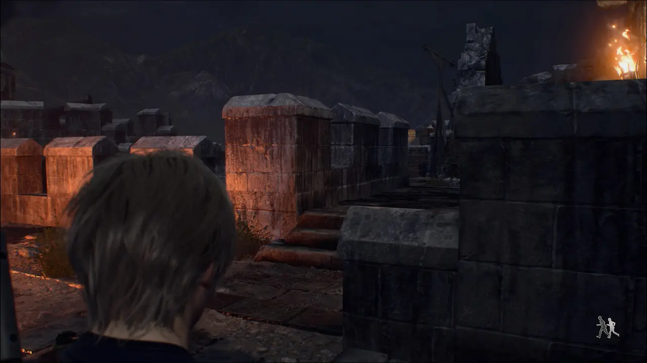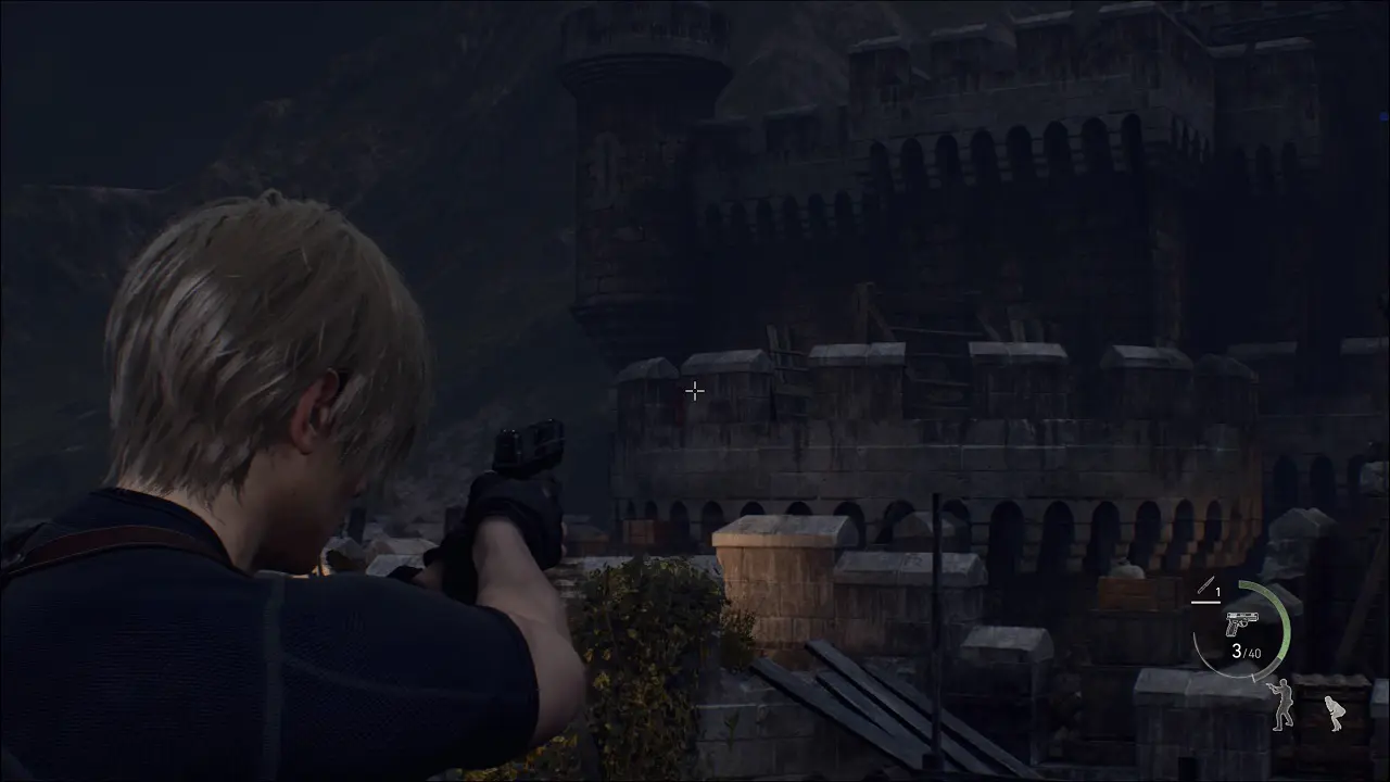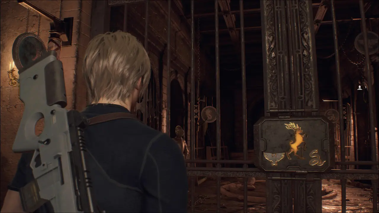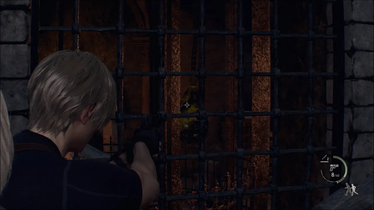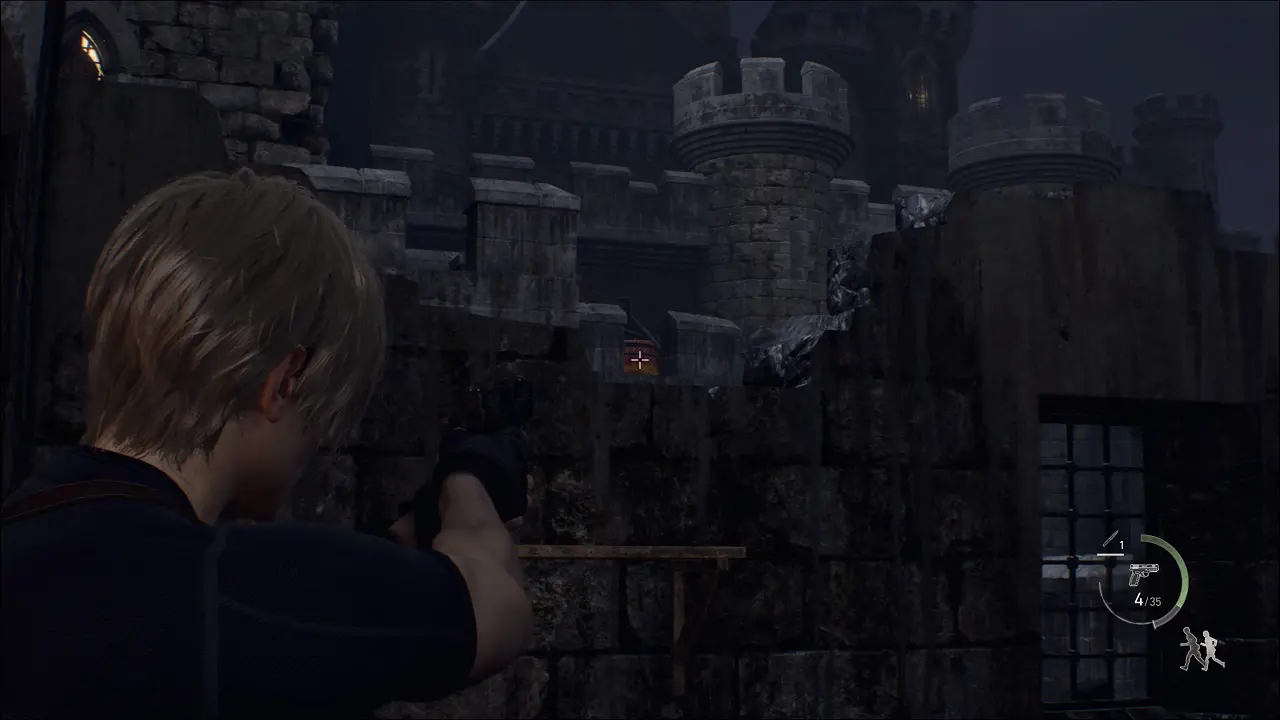 Volte e quebre o barril diretamente a sua frente, suba as escadas e use o binóculo no parapeito para ver um inimigo distante. Continue pelo caminho até chegar em um grande portão, nesse ponto, passe pela porta a direita, você estará em uma sala com seu primeiro inimigo. Ele está infectado por um tipo de La Plaga mais agressivo, e atacará com tudo. Caso ele pule sobre você, esteja atento para se defender. Atire na criatura em sua cabeça para impor mais dano.