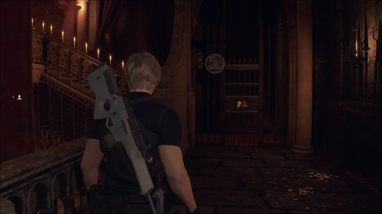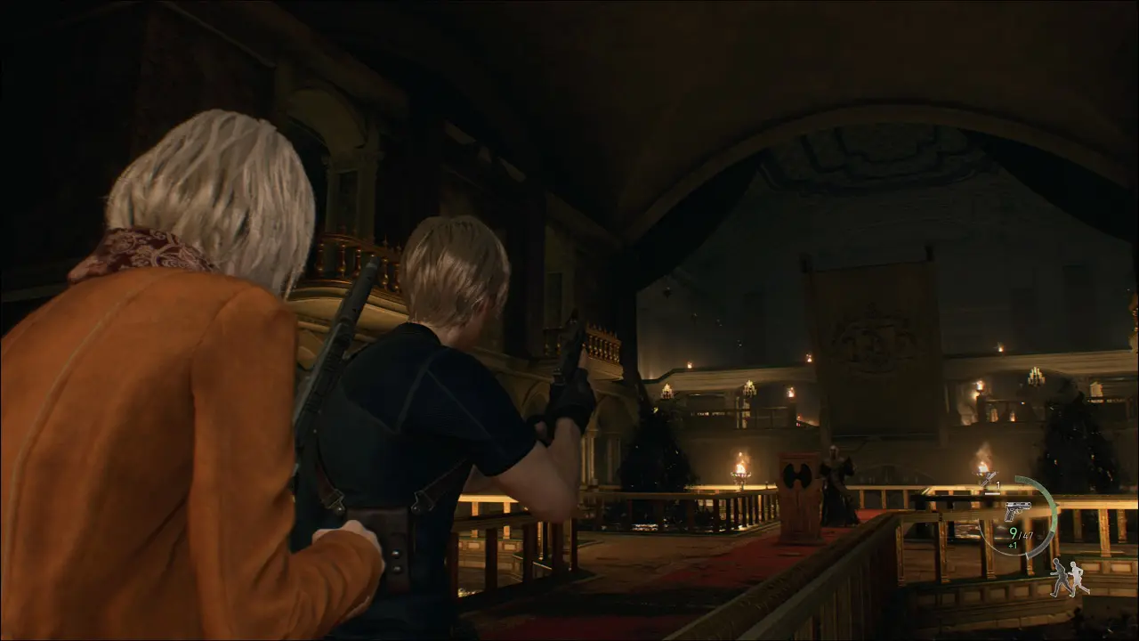 Vamos em frente chegando na área acima da Câmara de Audiência. Você deve primeiro ir para a direita, onde chutaremos uma escada para o andar inferior, embora se você perder isso Ashley chuta para baixo para você. Partindo da escada que derrubou, pule o primeiro lustre a esquerda, chegando do outro lado, quebre o vaso a esquerda e, no fundo do corredor, desça pelo buraco para chegar até um tesouro, Ampulheta Dourada (7/41). Estamos na parte inicial, precisaremos subir novamente até a parte dos lustres, faça isso usando o mesmo trageto anterior.