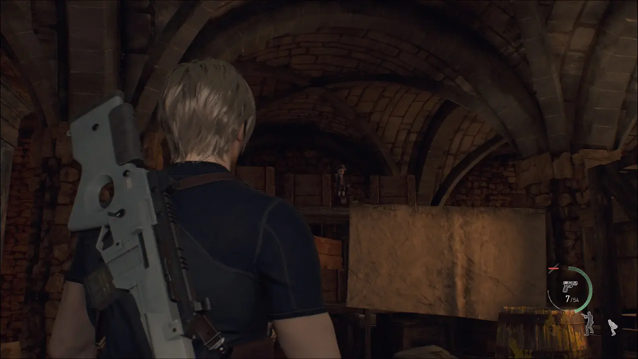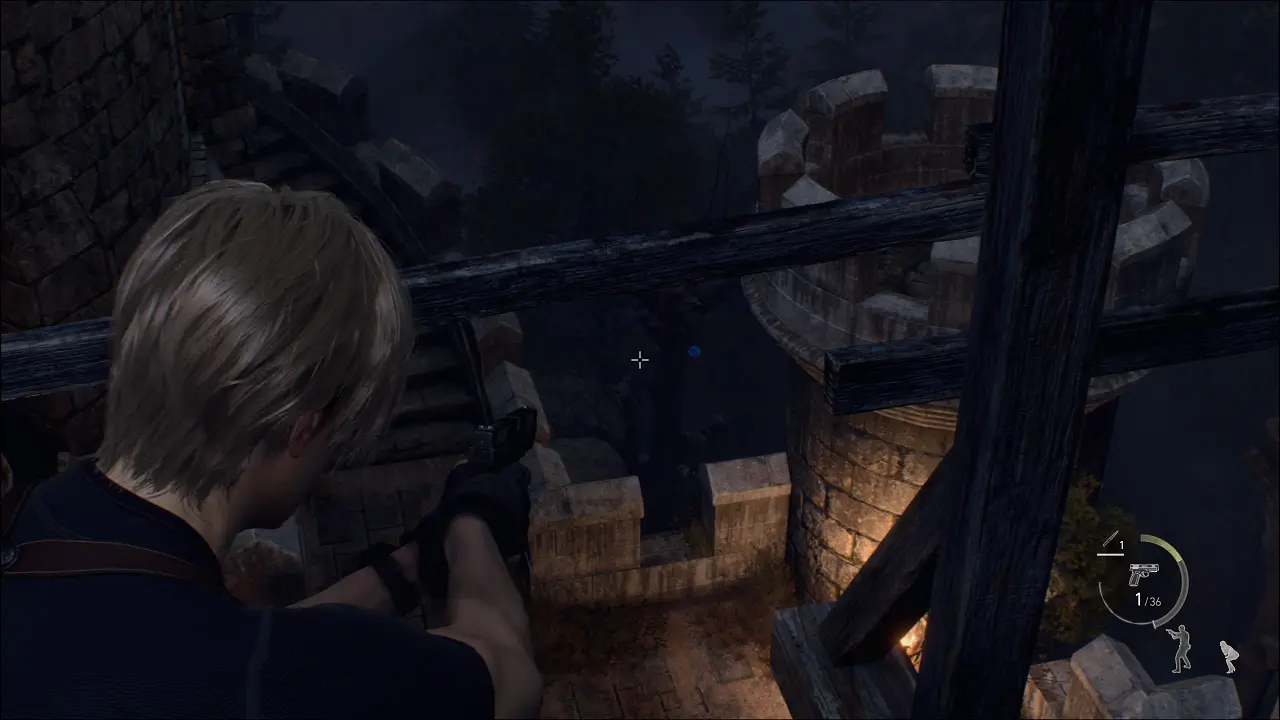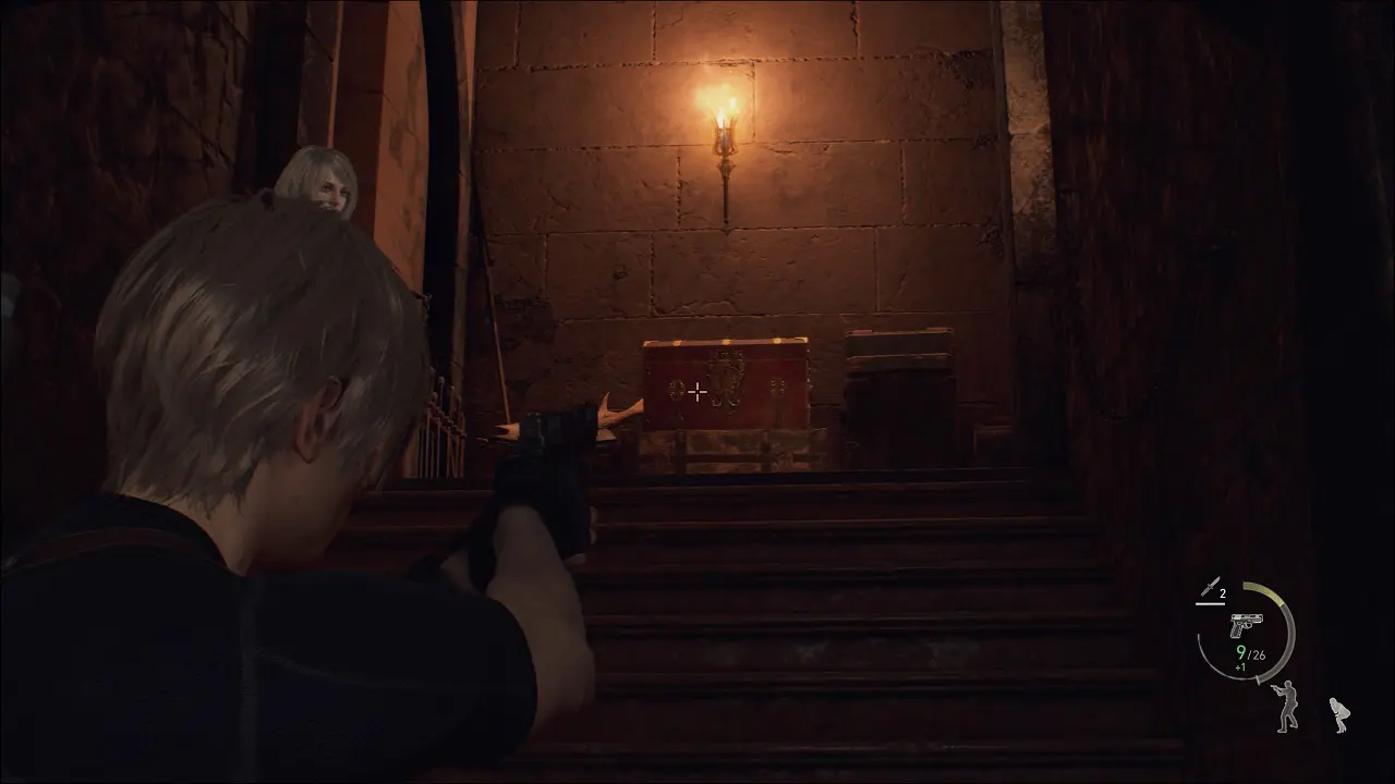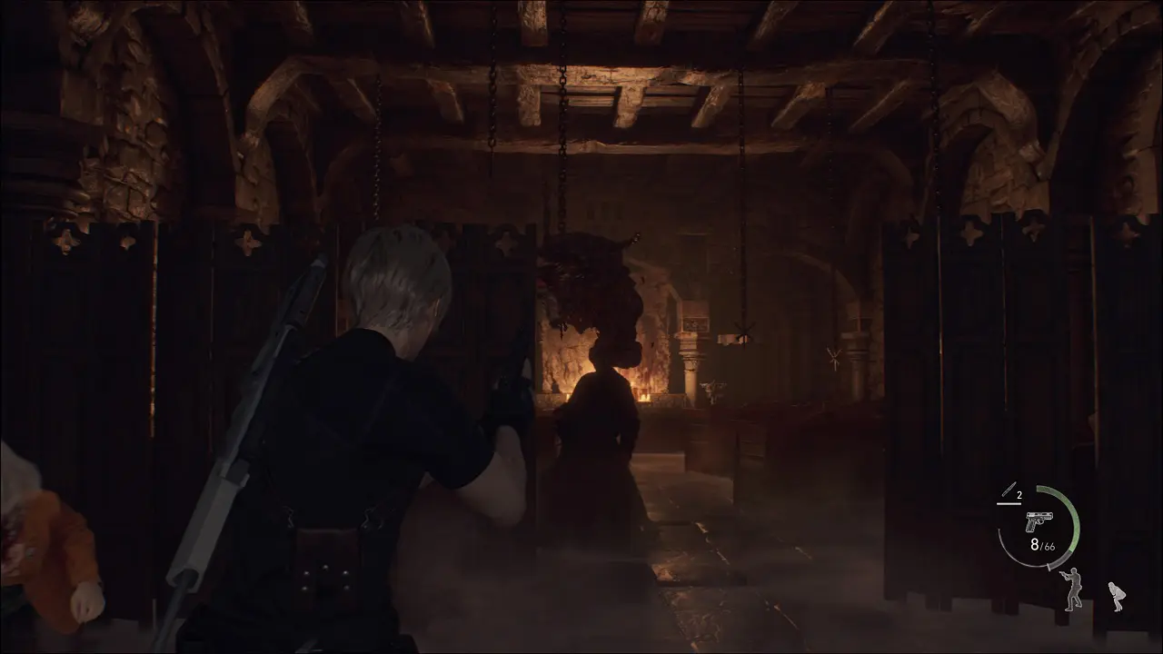 Volte e quebre o barril diretamente a sua frente, suba as escadas e use o binóculo no parapeito para ver um inimigo distante. Continue pelo caminho até chegar em um grande portão, nesse ponto, passe pela porta a direita, você estará em uma sala com seu primeiro inimigo. Ele está infectado por um tipo de La Plaga mais agressivo, e atacará com tudo. Caso ele pule sobre você, esteja atento para se defender. Atire na criatura em sua cabeça para impor mais dano.