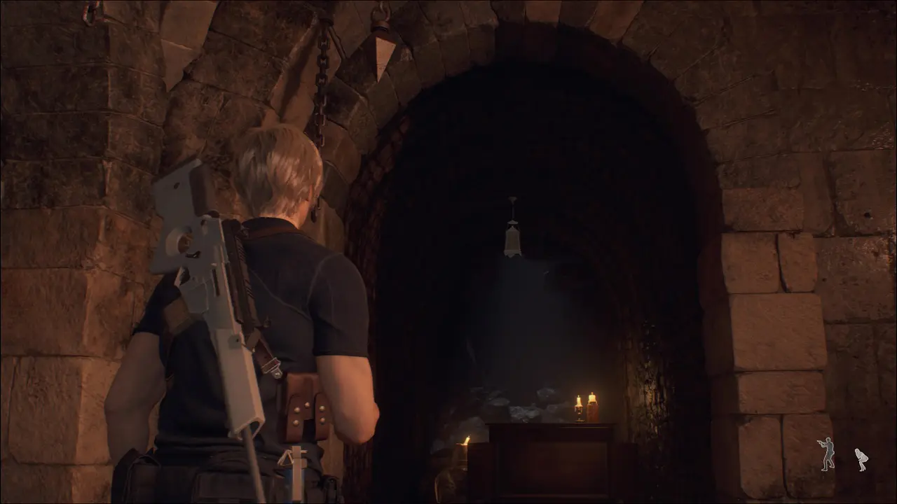 Siga descendo as escadas e pegando a Erva Vermelha e a Munição. Estaremos em uma masmorra, onde alguém está preso, repare que em uma cela a esquerda temos mais um item. Siga até encontrar a Chave da Masmorra em um cadáver, ao pegar esse item, cairemos e teremos nosso primeiro contato com um inimigo específico, o Garrador. Teremos de matar esse inimigo apenas com a Faca para conseguir um troféu / conquista.