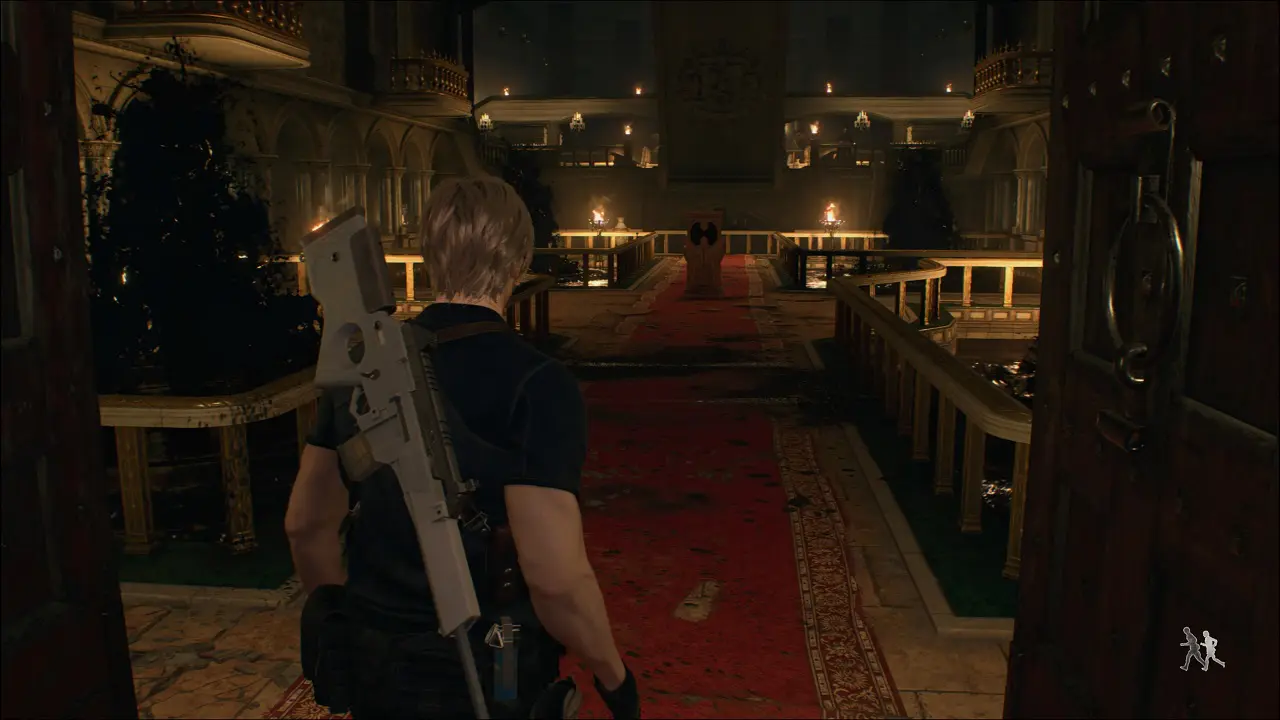 Vamos em frente chegando na área acima da Câmara de Audiência. Você deve primeiro ir para a direita, onde chutaremos uma escada para o andar inferior, embora se você perder isso Ashley chuta para baixo para você. Partindo da escada que derrubou, pule o primeiro lustre a esquerda, chegando do outro lado, quebre o vaso a esquerda e, no fundo do corredor, desça pelo buraco para chegar até um tesouro, Ampulheta Dourada (7/41). Estamos na parte inicial, precisaremos subir novamente até a parte dos lustres, faça isso usando o mesmo trageto anterior.