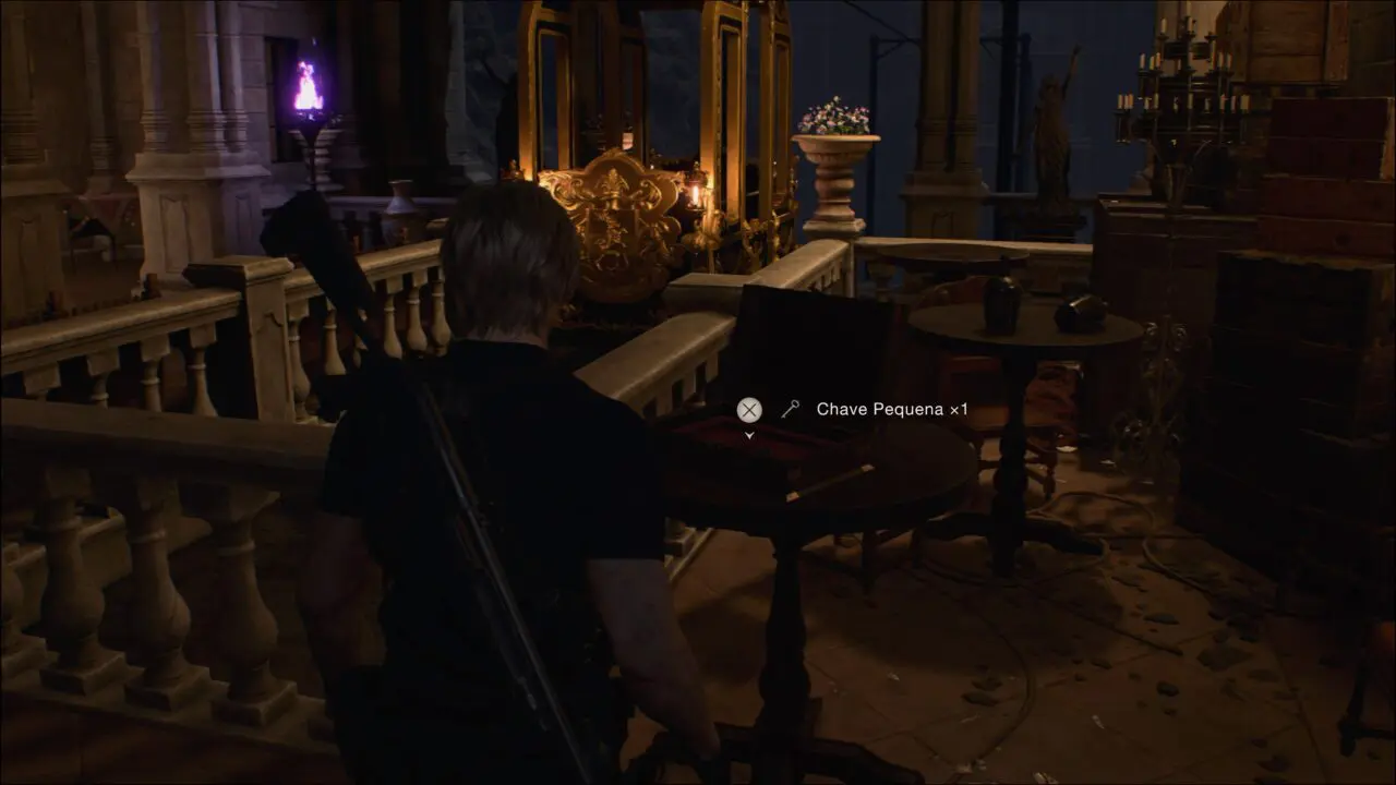 Quando o elevador parar, estaremos na sala ao norte do Salão de Baile, local que não podíamos entrar anteriormente, com um carrinho que leva à torre do relógio, mas não faremos isso agora, pois iremos atrás de mais itens pelo Castelo. No corrimão à direita do carrinho você pode encontrar a última Chave Pequena dessa região.