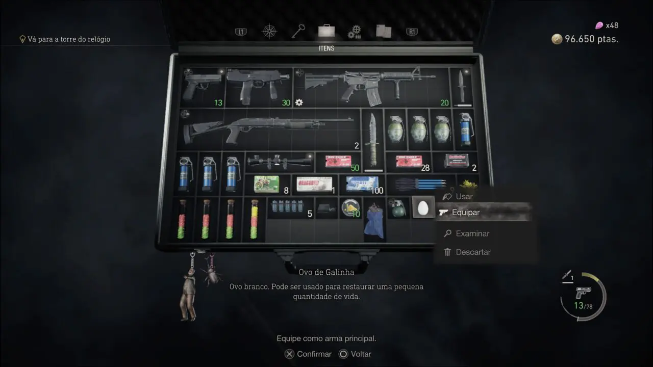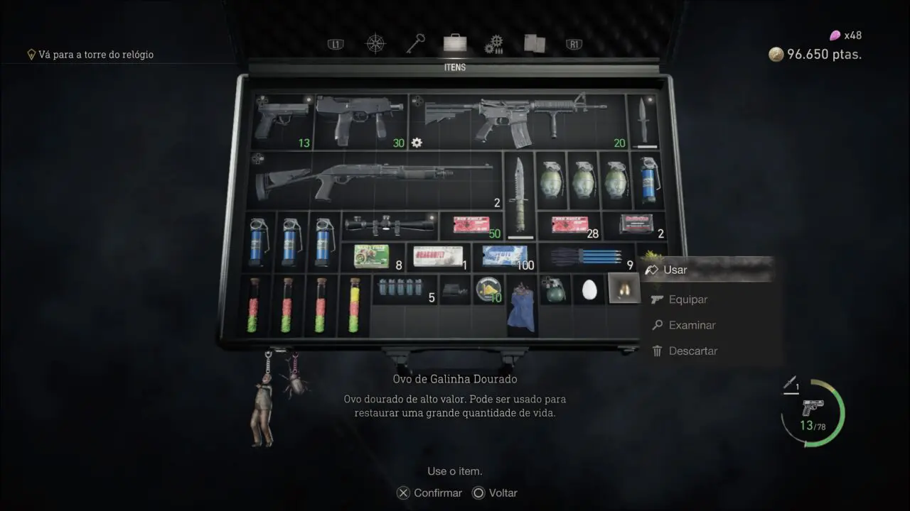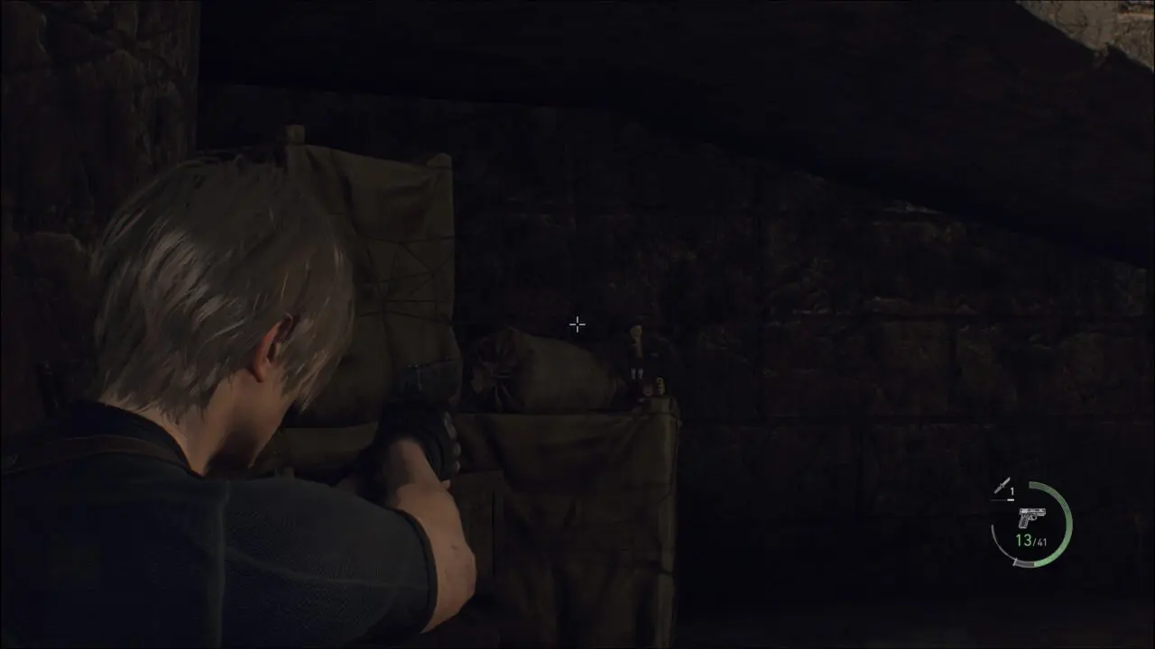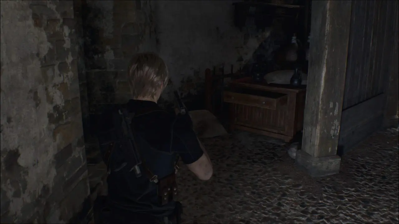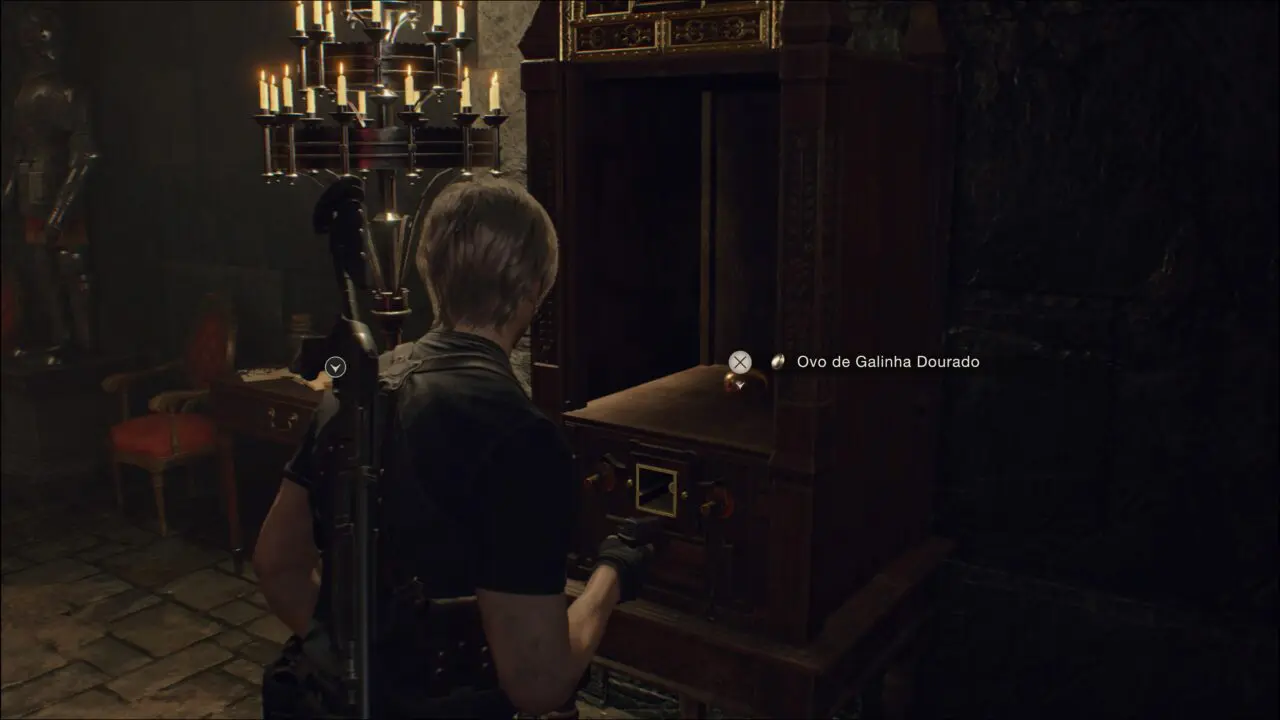 Assim que entrar, quebre as caixas para pegar os itens, abra a porta mais a frente e seremos recepcionados por Ramón. Tomando cuidado com os inimigos no local, siga imediatamente a esquerda e vá em frente beirando a parede, sobre uma caixa debaixo das escadas você encontrará o Castelão Mecânico (12/16).