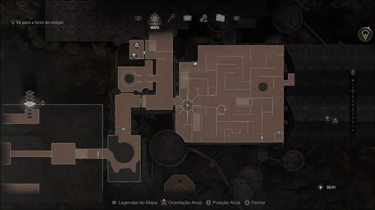 Nota: Ao subir pelo elevador, não poderemos mais voltar ao castelo. Certifique-se de ter pegado tudo por lá, você ainda pode voltar até p local onde Luis morreu.