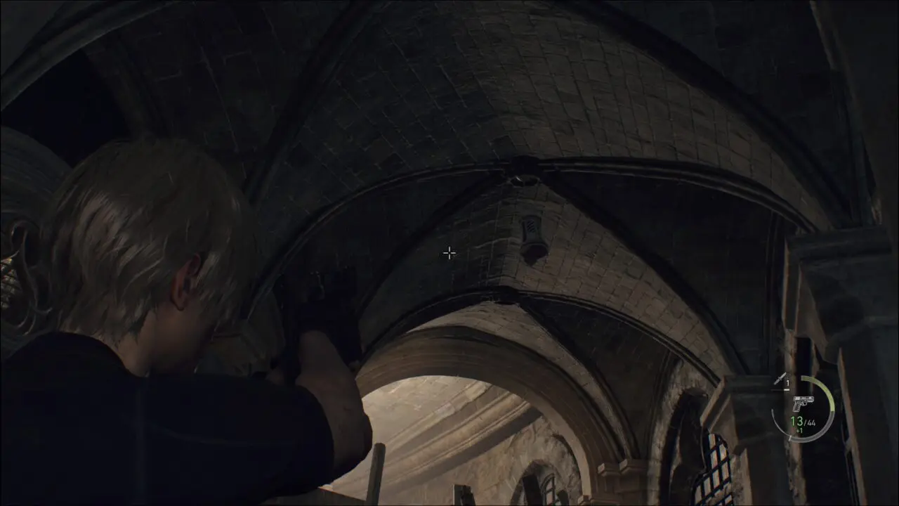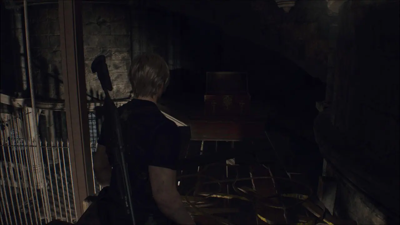 Agora, volte para o Pátio e suba as escadas a esquerda, antes de sair do jardim. Passe pelo local onde resgatamos Ashley no final do capítulo 8 e continue até chegar no portão fechado. Repare que no canto superior direito tem um peso que mantém a porta fechada, atire nele para abri-lá, o tesouro esta no local das fotos abaixo, usaremos a Chave Pequena que pegamos no início desse capítulo para pegar o Besouro Adornado (36/41)