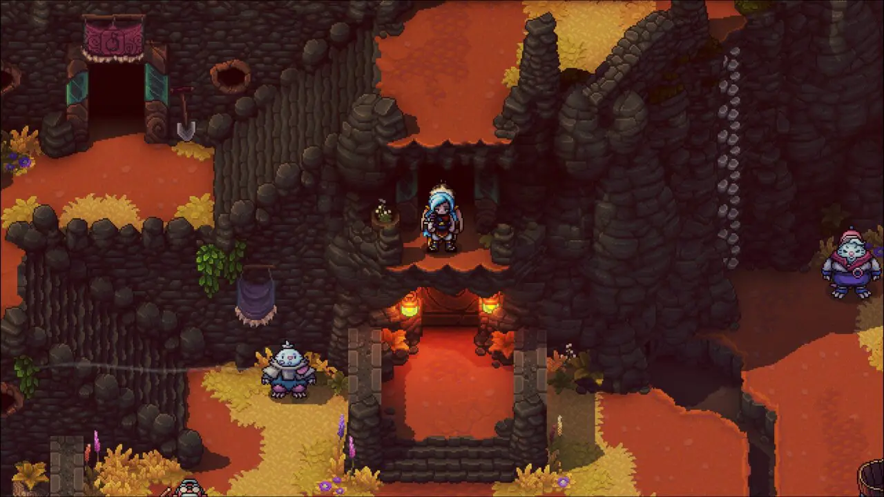 Assim que entrar na área, pule na cachoeira para chegar a parte inferior do local, perceba que também temos a possibilidade de sermos lançados para cima por meio de gêiseres. Atrás da cachoeira temos um baú com uma Roupa de Pirata. Na parte sul, temos dois Grãos, pegue tudo e salve seu progresso. Desça pela cachoeira e encontraremos os primeiros inimigos nativos, um Siril e um Peixe-Destroçador. Note que esses inimigos, apesar de serem fracos, possuem golpes que podem tirar até 60 de PV, mas eles não vão usar regularmente.