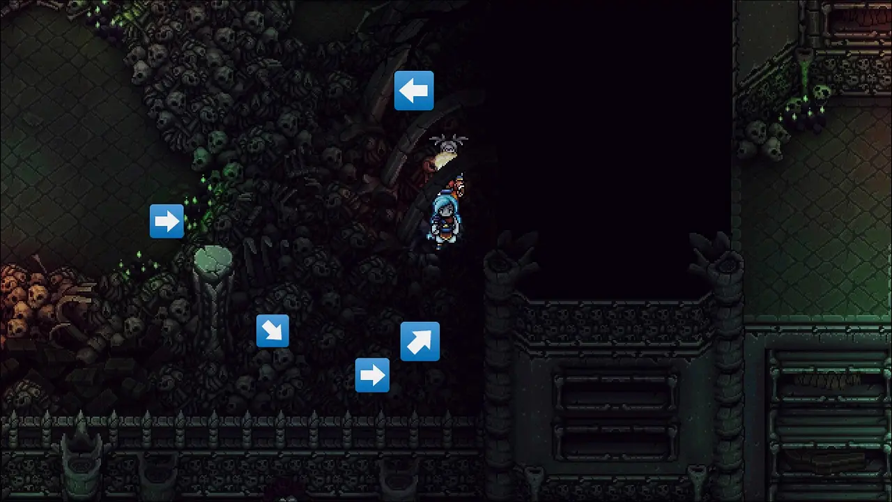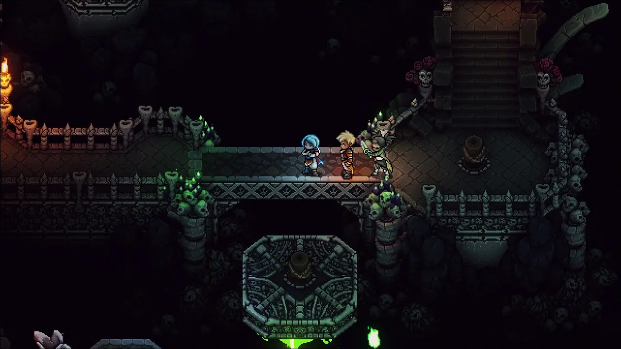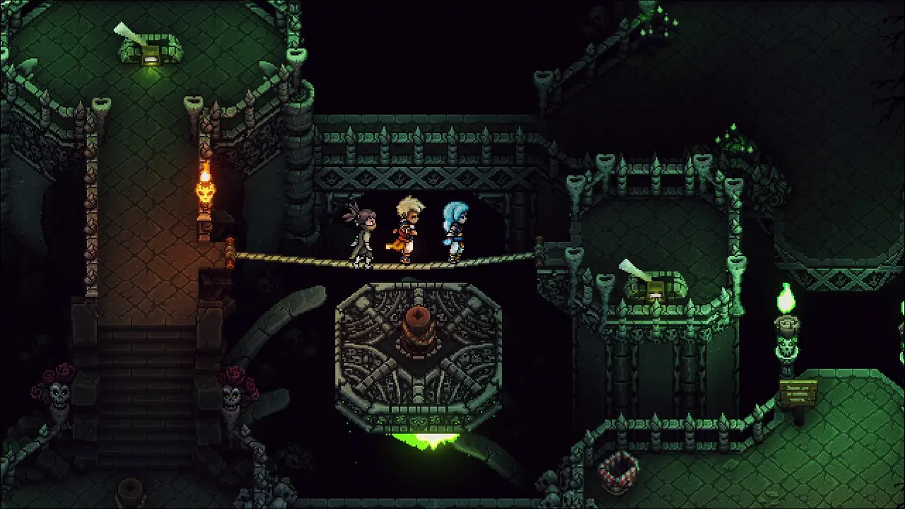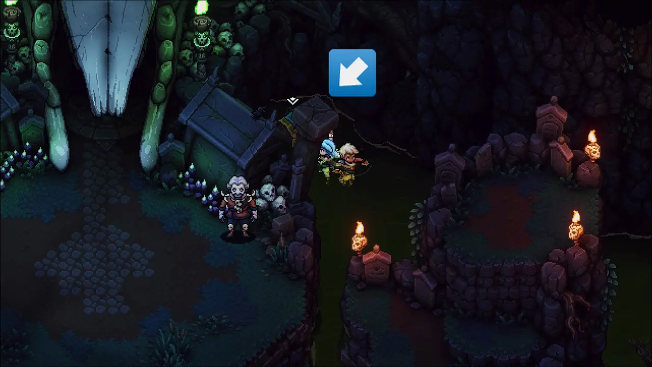 Volte e note o apoio que surgiu, siga por ele e saia pelo lago para chegar a área com o ponto de controle, salve seu progresso antes de continuarmos. Volte e siga a esquerda agora, após algumas plataformas, estaremos entrando em uma caverna. Elimine os inimigos e siga para o norte, use seu gancho para puchar a plataforma e ter acesso a alavanca, acione ela e note que criamos um caminho a oeste, vamos seguir por esse caminho, passe pela porta norte e pegue o Cajado Ósseo, equipe imediatamente em Valere. Partindo desse item, vamos para leste (direita) através da plataforma usando o gancho, pegue a Torta Berçolunar na cesta e siga ao norte, usando o inimigo como aporte para o gancho.