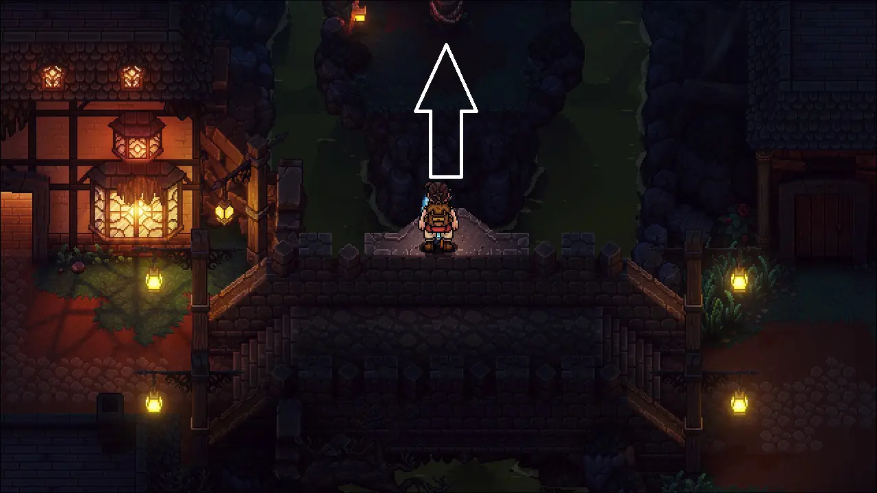Quando estiver no controle, vamos explorar o local pela última vez, note que nosso amigo cozinheiro está de volta ao grupo. Saia da estalagem e siga para leste, até chegar na ponte, suba no para-peito e use seu gancho para chegar na plataforma no norte, siga e pegue algumas Batatas e no final, encontraremos um baú com um Minério de Obsidiana. Do la do oposto a esse item, no sul, use mais um tronco para chegar na parte superior da estalagem, entre e pegue o Biscoito Turbo.