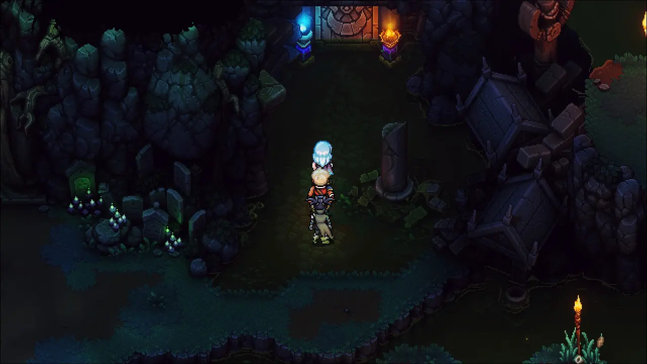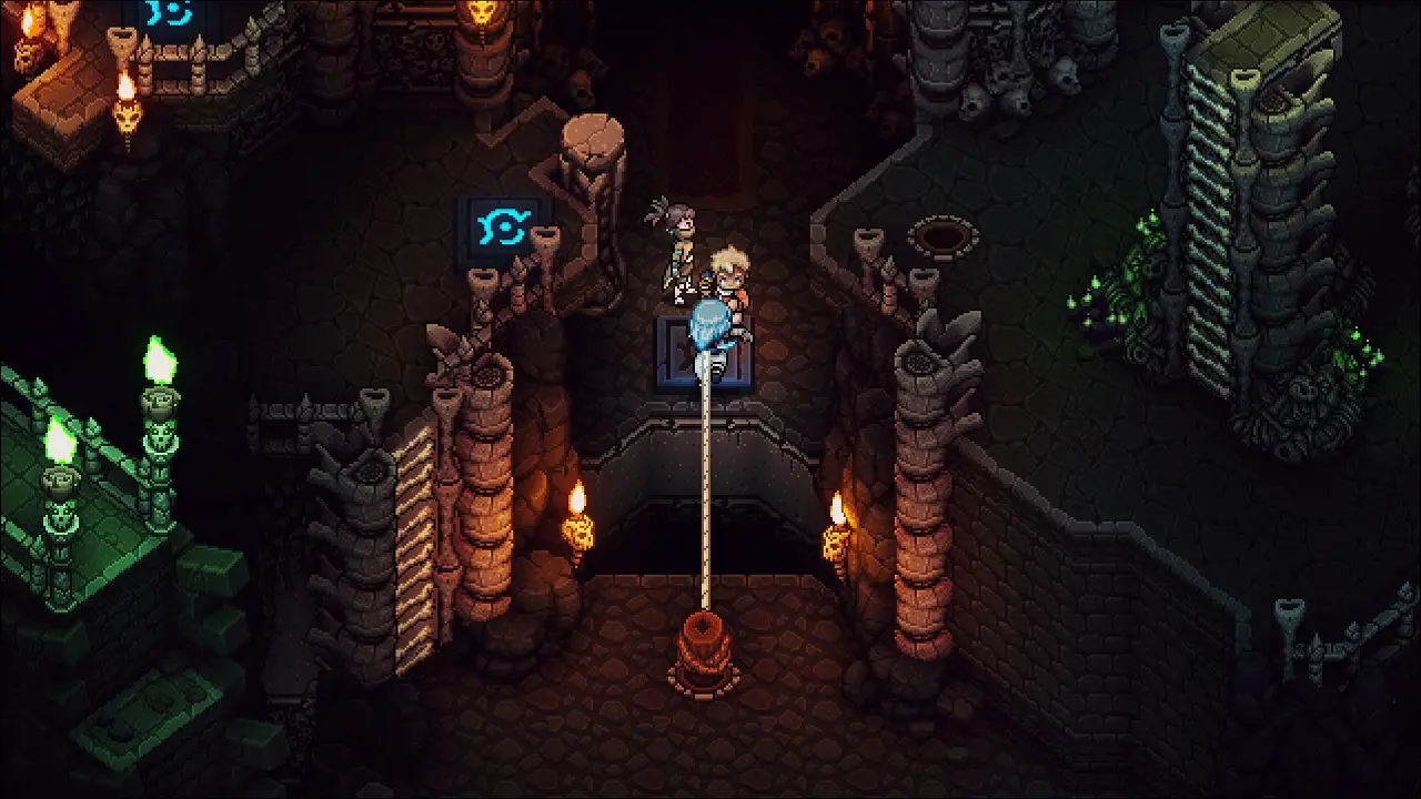 Volte e note o apoio que surgiu, siga por ele e saia pelo lago para chegar a área com o ponto de controle, salve seu progresso antes de continuarmos. Volte e siga a esquerda agora, após algumas plataformas, estaremos entrando em uma caverna. Elimine os inimigos e siga para o norte, use seu gancho para puchar a plataforma e ter acesso a alavanca, acione ela e note que criamos um caminho a oeste, vamos seguir por esse caminho, passe pela porta norte e pegue o Cajado Ósseo, equipe imediatamente em Valere. Partindo desse item, vamos para leste (direita) através da plataforma usando o gancho, pegue a Torta Berçolunar na cesta e siga ao norte, usando o inimigo como aporte para o gancho.