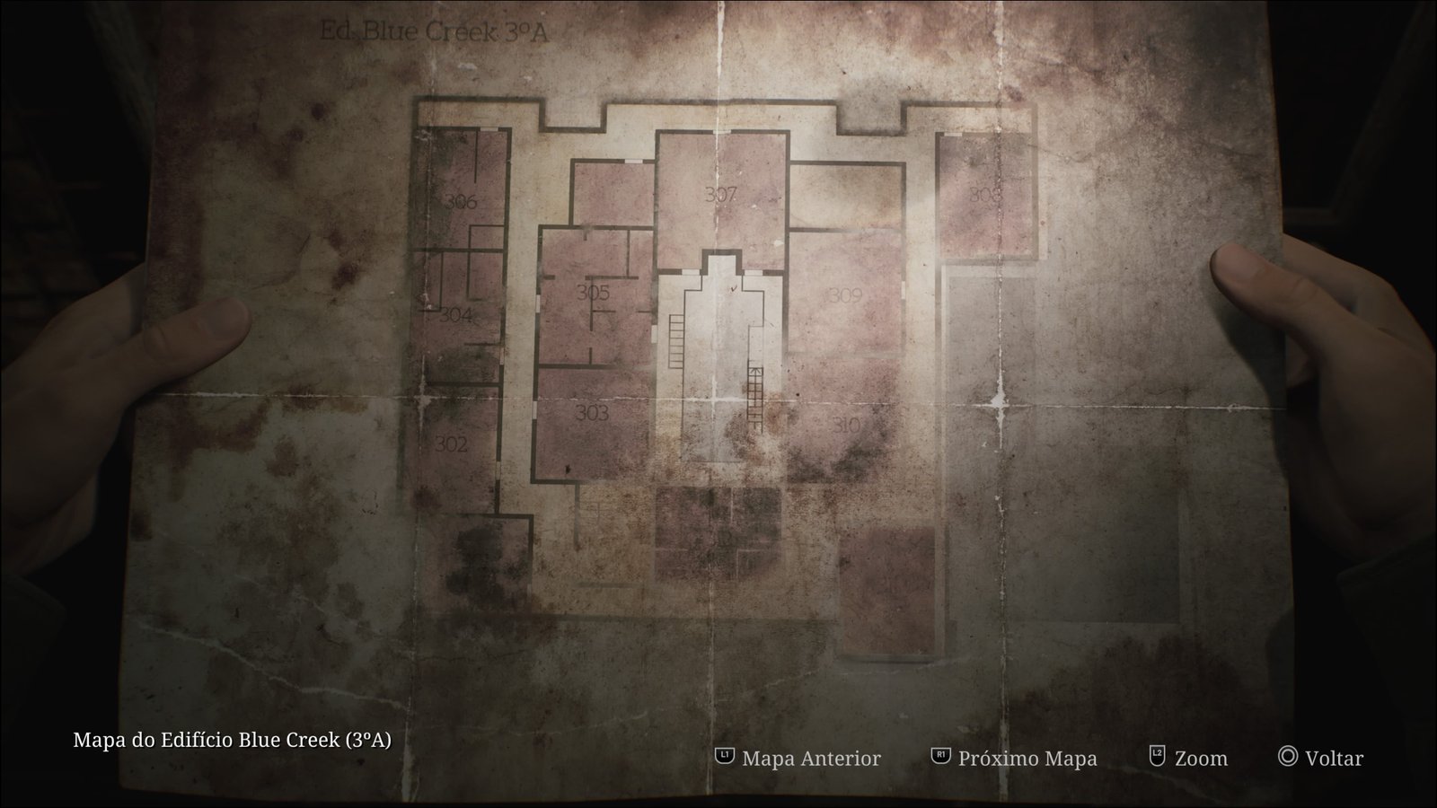 James foi parar em outro prédio, o Edifício Blue Creek, mas agora estará no que é chamado de Outro Mundo, uma versão caótica e destruída do mundo real. O Apartamento 208 em que estamos não tem nada que possamos pegar, então saia pela porta entreaberta. No corredor, vá primeiro para a direita e pegue Balas de Pistola na poltrona. Siga pelo lado oposto do corredor, até encontrar um quadro de avisos com o Mapa do Edifício Blue Creek 1ºA, o Mapa do Edifício Blue Creek 2ºA e o Mapa do Edifício Blue Creek 3ºA. Começaremos no segundo andar.